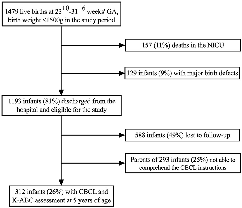 In the study period 1,479 infants were born alive with a gestational age between 230/7 and 316/7 weeks and birth weight <1,500 g. Of these, 157 infants (11%) died in the neonatal intensive care unit and 129 infants (9%) had major birth defects and were therefore excluded from the study. Thus, 1,193 infants were eligible for CBCL and K-ABC assessment at 5 years of age. Of those, 588 infants (49%) were lost to follow-up because they did not participate in the 5 years follow-up at all and 293 infants (25%) could not be included because the parents were not able to comprehend the task instructions. Consequently, 312 infants (26%) had information on CBCL and K-ABC scores at 5 years of age and entered the final analysis (Figure 1).