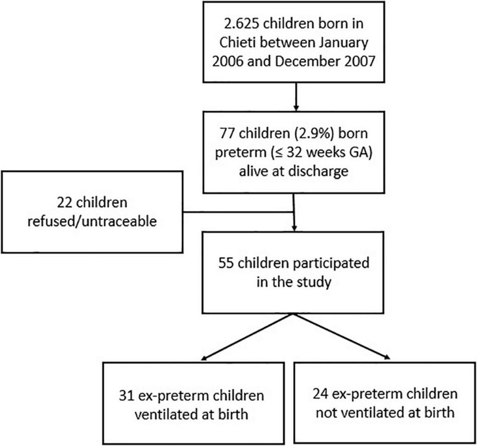 The study was carried out at the Pediatric Allergy and Respiratory Unit of the University of Chieti. Children born in Chieti in 2006–2007 were 2,625. Infants born ≤ 32 weeks of gestational age and alive at discharge were 77 (2.9%); 55 ex-preterm children were enrolled in the study at 11 years of age, while 22 refused or were untraceable. Asthma and atopy were not exclusion criteria. The study was approved by the Ethical Committee of the University of Chieti (protocol number 4205), and written consent was obtained from the parents of the enrolled children. Figure 1 provides the flow chart of the study.