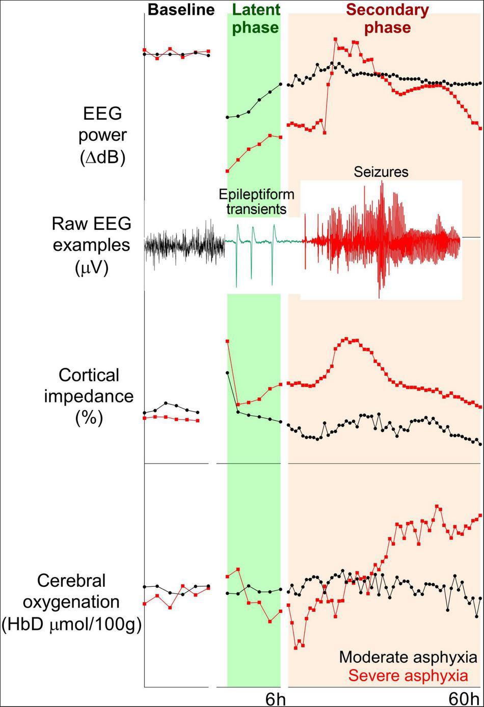 In preterm fetal sheep, however, there was a significant fall in cerebral oxygenation measured by near-infrared spectroscopy (NIRS) at 2–3 h after umbilical cord occlusion, corresponding with the peak of epileptiform transient activity, suggesting a mismatch between perfusion and metabolism (Figure 2). Speculatively, this transient period of secondary hypoxia could exacerbate neural injury (18), although suppressing the epileptiform activity with dizocilpine, a potent anti-excitotoxic agent, was associated with only a minimal improvement in neuronal loss in the cornu ammonis 1/2 region of the hippocampus (25). Clinically, there are limited data on neurophysiological changes during this critical early period after birth. In the pre-hypothermia era, severe HIE in term infants was associated with reduced cerebral blood volume, oxygenation, and cytochrome oxidase during the first 12 h after birth (26).