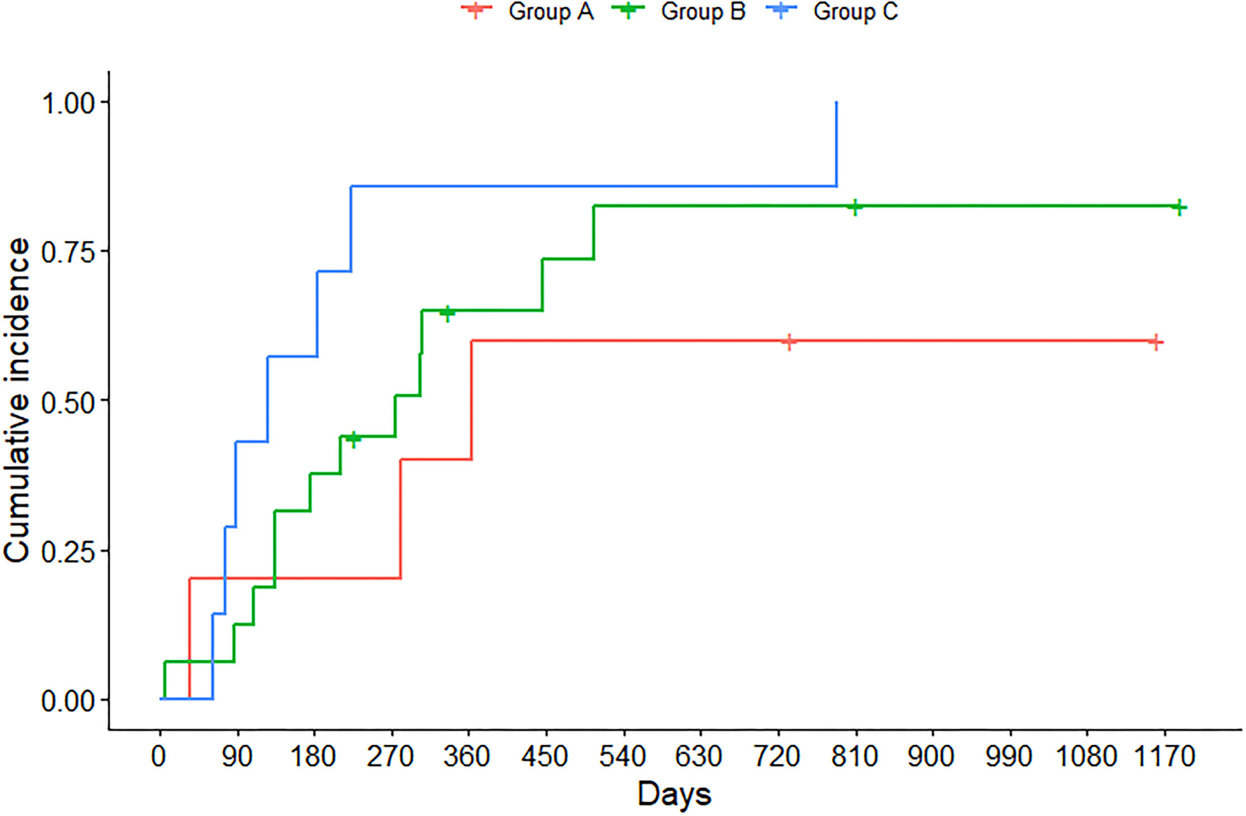 Time at which children and adolescents experienced hospitalization due to pulmonary exacerbation (PE), stratified by FEV1z-score and LCI at 1/40th of starting concentration. Group A identifies individuals with FEV1 ≥ LLN and LCI < ULN; group B individuals with FEV1 ≥ LLN and LCI ≥ ULN, whereas group C individuals with FEV1 < LLN and LCI ≥ ULN.
