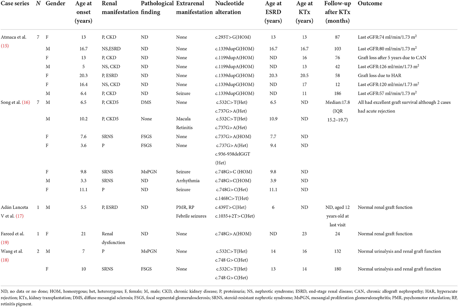 In conclusion, our results show that COQ8B-GN in the Chinese population often develops symptoms of asymptomatic proteinuria or SRNS before the age of 10 years. FSGS is the most prevalent pathological finding, and c.748G>C variant of the COQ8B gene is the most frequent genetic mutation in Chinese patients. More than half of the Chinese patients would progress to ESRD at diagnosis or within 2 years of diagnosis during the period of early adolescence. Despite the risk of allograft rejection, renal transplantation is feasible for COQ8B-GN patients with ESRD due to the low risk of recurrence.