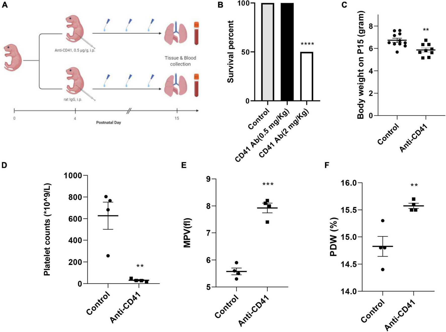 Effective platelet depletion with anti-CD41 antibody resulted in weight loss in newborn mice. Experimental scheme (A) of the newborn mice treated with anti-CD41 antibody or isotype (0.5 mg/Kg body weight, intraperitoneal) at postnatal day 4 (P4), P7, P10, and P13. Mice were sacrificed on day 15. Mortality (B) and body weight (C) on postnatal day 15 from mice in control (n = 11) and anti-CD41 group (n = 10). Platelet counts (D), mean platelet volume (E) and platelet distribution width (F) in mice treated with anti-CD41 antibody or isotype, n = 4 in each group. Values are expressed as mean ± SEM, **p < 0.01, ***p < 0.001.
