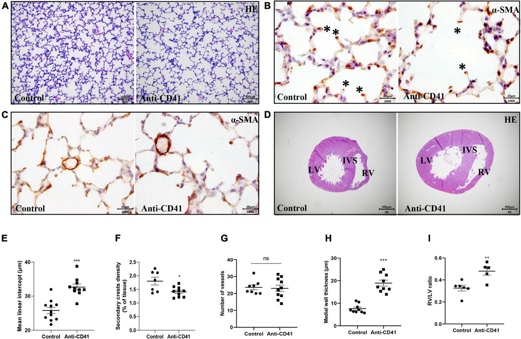Platelet depletion impaired lung alveolarization and caused vascular remodeling but did not affect angiogenesis in neonatal mice. Representative images of hematoxylin-eosin (HE, A) and α-smooth muscle actin (α-SMA, B,C) stained lungs from pups treated with anti-CD41 antibody or isotype. Representative images of HE-stained hearts taken halfway the long axis (D). Quantification of mean linear intercept (MLI, E), secondary crest density corrected for tissue area (F), number of vessels (G), medial wall thickness (H) and right ventricular hypertrophy (RVH, I). Data are expressed as mean ± SEM, **p < 0.01. ***p < 0.001. Asterisks indicate secondary crests.
