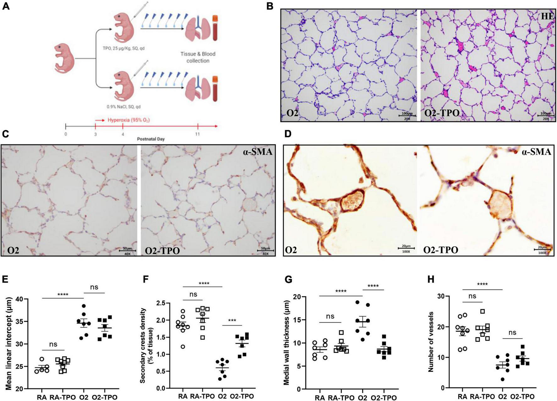 TPO attenuates experimental BPD. Experimental scheme (A) of the newborn mice exposed to hyperoxia and treated with TPO or NaCl once a day from postnatal day 4 to 10. Representative images of HE (B) and α-SMA (C,D) stained lungs. Quantification of MLI determined on HE stained lung (E), secondary crest density corrected by tissue area determined on α-SMA stained lung (F), medial wall thickness (G) and the number of vessels (H). Data are expressed as mean ± SEM, ***p < 0.001, ****p < 0.0001.