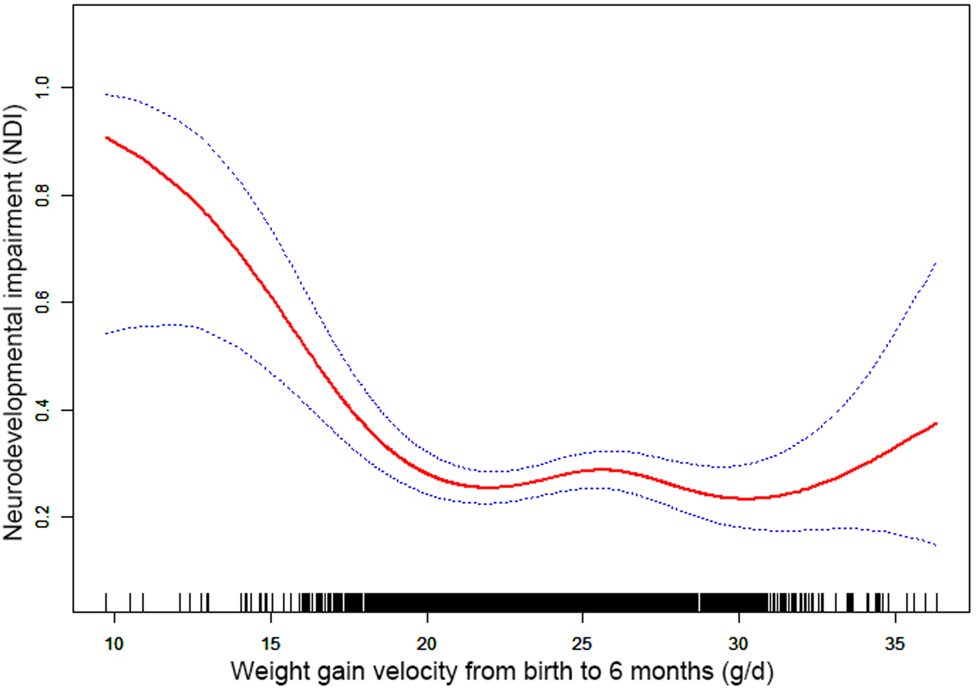To account for the nonlinear relationship between the weight gain velocity in different periods and NDI, we also used the generalized additive model and the smooth curve fitting (penalized spline method) to further explore the shape of their relations. In addition, a two-piece-wise binary logistic regression model was also used to explain the nonlinearity further.