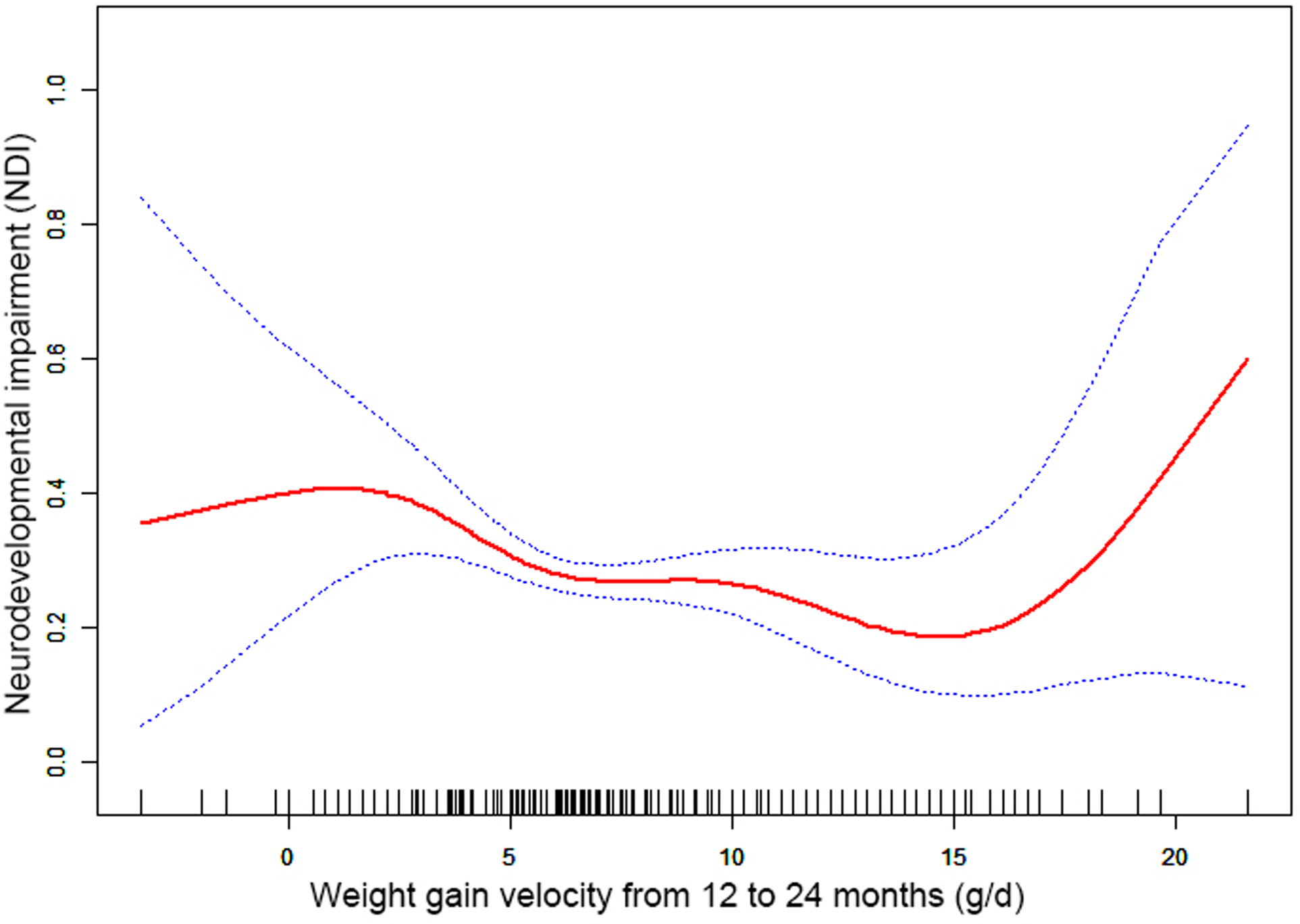 For the weight gain velocity from birth to 6 months CA, in the fully adjusted model, 1 g/d increase of weight gain velocity was related to 5% decrease in risk of NDI [odds ratio (OR) = 0.95, 95% confidence interval (CI) 0.92–0.99, p < 0.01]; 1 g/d increase of weight gain velocity from 6 to 12 months CA was related to 3% decrease in risk of NDI (OR = 0.97, 95% CI 0.94, 1.00, p = 0.049); and 1 g/d increase of weight gain velocity from 12 to 24 months CA was related to 5% decreases in risk of NDI (OR = 0.95, 95% CI 0.90, 0.99, p = 0.02). All results are statistically significant (Table 2).