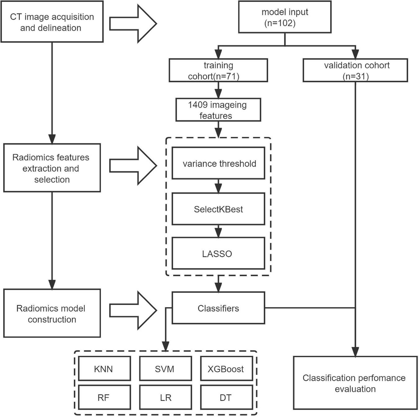 Based on the clinical data and the follow-up imaging analysis, the training and validation cohorts were stratified and randomly sampled at a ratio of 7:3 to establish the training cohort (n = 71) and the validation cohort (n = 31), and the number of random seeds was 734. Six classifiers, including KNN, SVM, XGBoost, RF, LR, and DT, were used to construct an Radiomics-based machine learning model to model MPP with SPP.