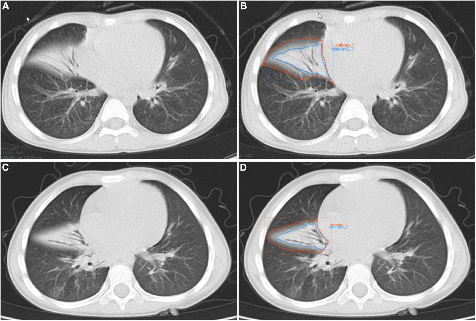 Manual delineation on lung window CT images in a 25-month female patient with mycoplasma pneumoniae pneumonia (A,B) and a 21-month male patient with streptococcus pneumoniae pneumonia (C,D). CT shows the similar appearances with consolidation and surrounding halo in middle lobe of right lung (A,C), and two ROIs (blue line and orange line) are delineated in each patient.