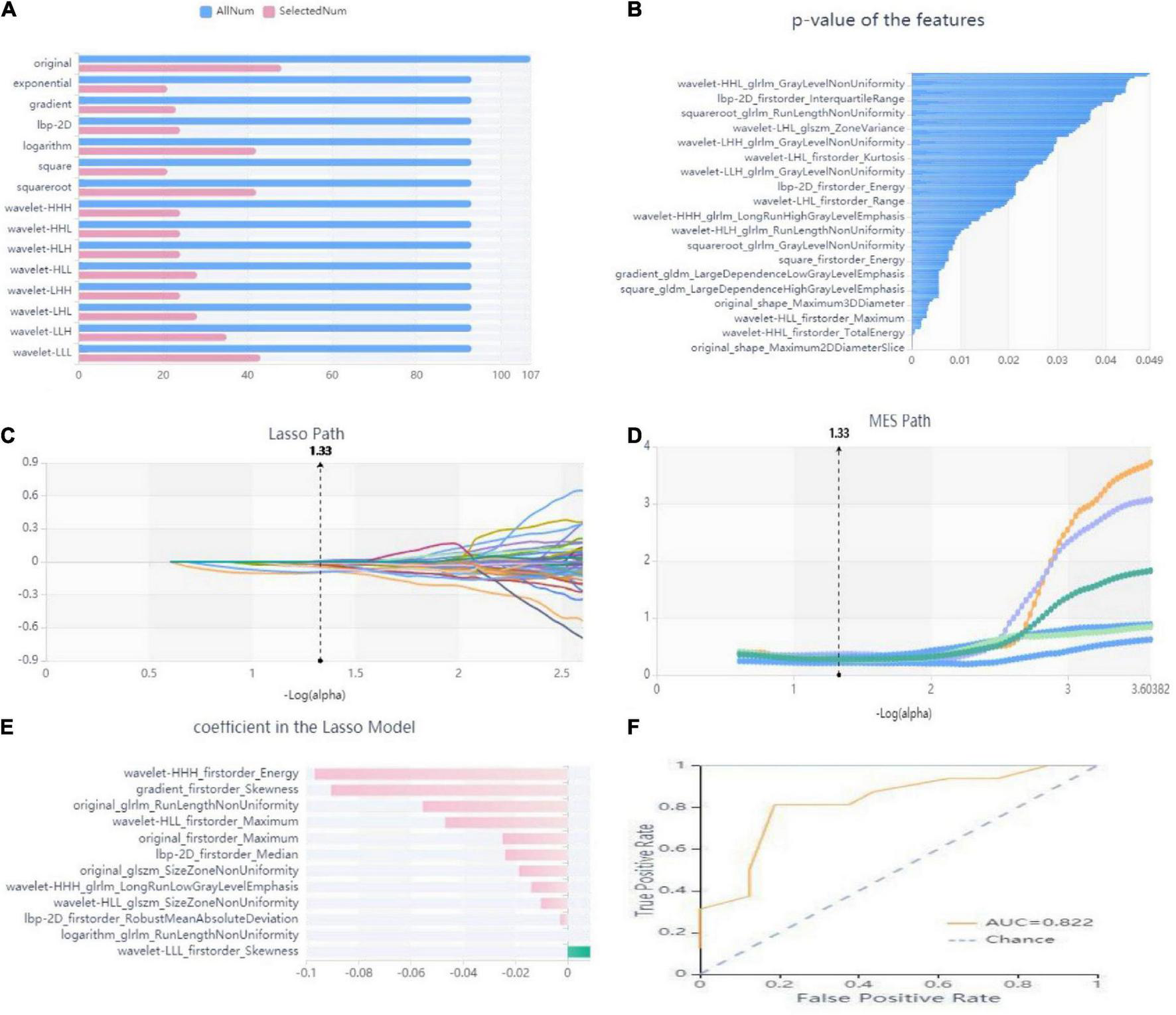 Workflow model construction and radiomics analysis. (A) A variance threshold on feature select. The blue bar represents the number of all the extracted radiomics features, and the pink bar represents the number of radiomics features screened by variance threshold method. The vertical axis is 15 kinds of filtering methods (variance threshold = 0.8). (B) SelectKBest on feature select. The abscissa is the P-value of the feature, and the ordinate is the feature whose P value < 0.05 is screened by SelectKBest method. (C–E) Schematic diagram of feature screening by Lasso method: (C) Lasso path, where the abscissa is the log value of α, and the ordinate is the coefficient of the feature. (D) The abscissa of the MSE path is the log value of α, and the ordinate is the mean square error. (E) Regression coefficient of Lasso model, where the abscissa represents the regression coefficient and the ordinate represents the selected features. (F) ROC curve of the RF model. Yellow curve is MPP cohort, blue curve is SPP cohort.