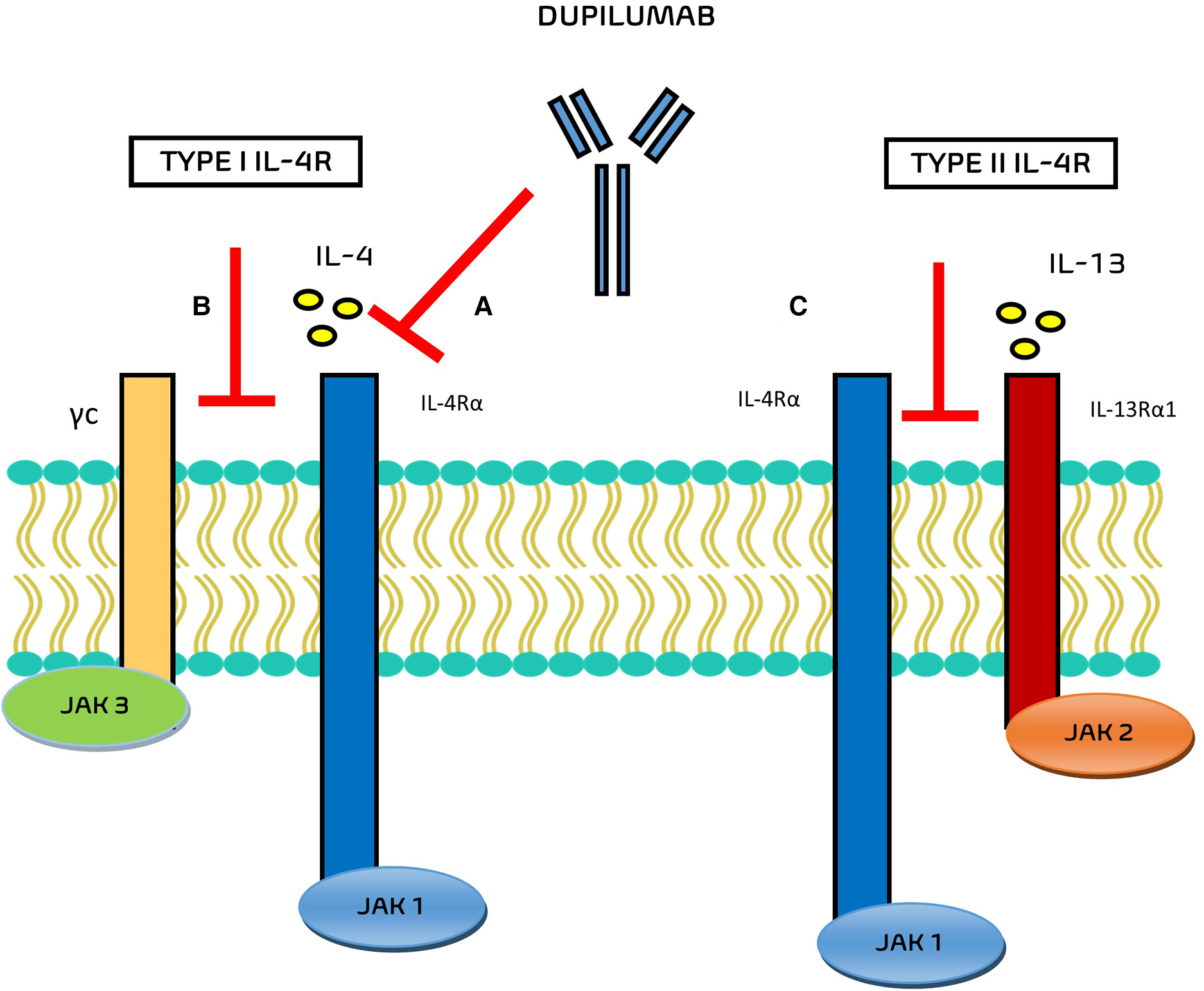 Mechanisms of action of Dupilumab. (A) Dupilumab inhibits IL-4 binding to IL-4Rα and/or (B) inhibits the recruitment of γc to IL-4Rα chain. (C) Dupilumab inhibits the recruitment of the IL-4Rα to IL-143Rα1.