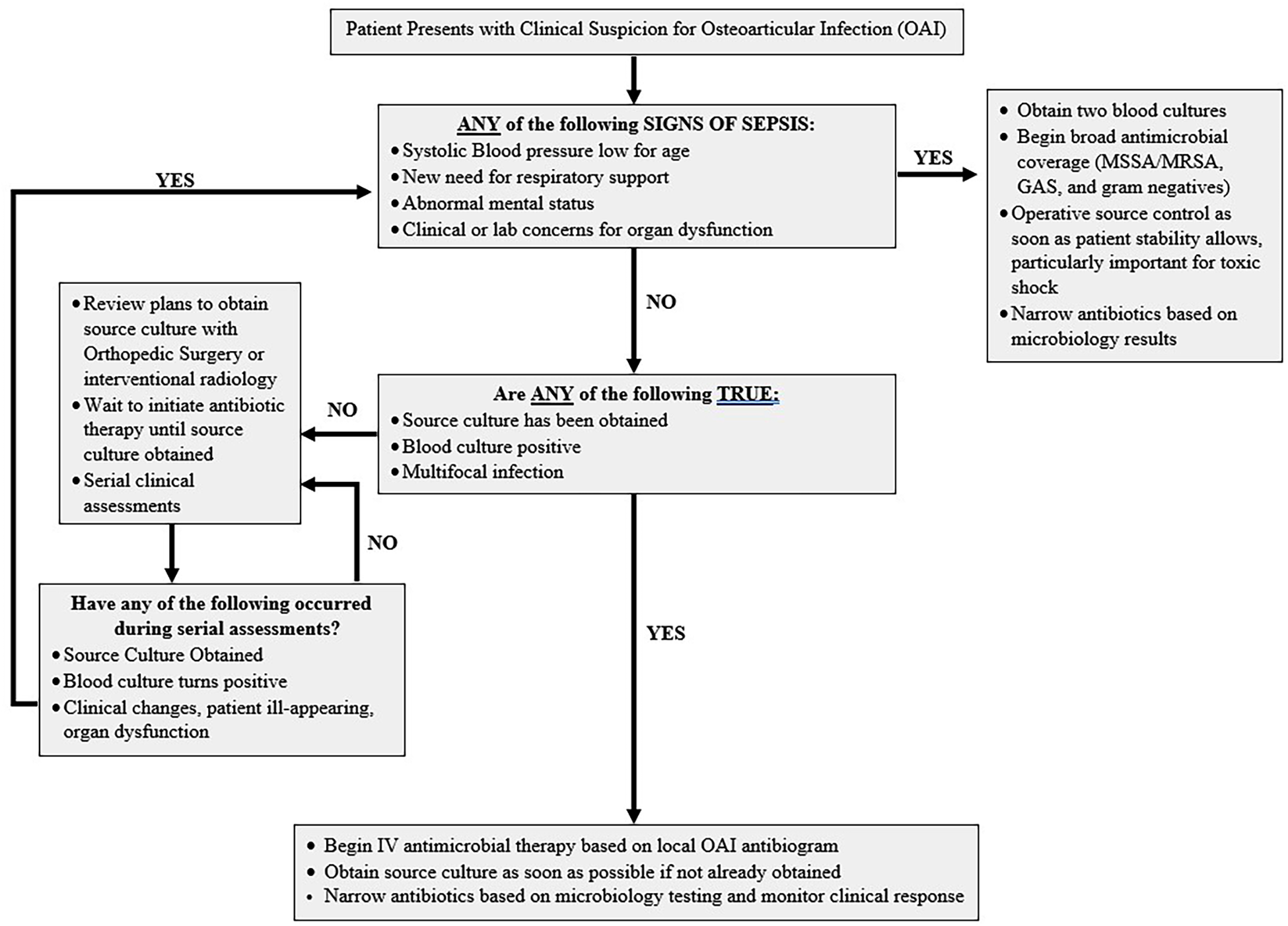 Searns SP Donaldson N Sanders J De S Soucie C Stewart J et al Children's hospital colorado clinical pathway: Musculoskeletal (MSK) Infection 2020 Available at: https://www.childrenscolorado.org/49e72a/globalassets/healthcare-professionals/clinical-pathways/musculoskeletal-infection.pdf