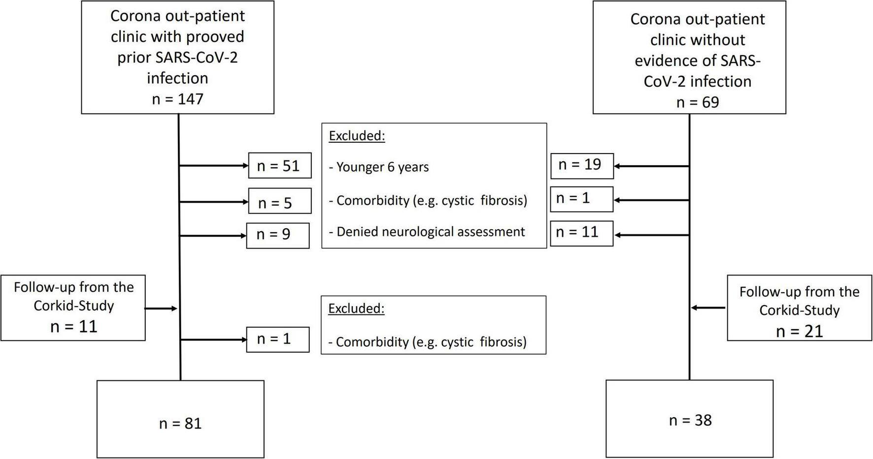 After exclusion due to age (<6 years), any comorbidity associated with peripheral neuropathy (like diabetic mellitus, cystic fibrosis) or declining neurological examinations, 81 children and adolescents with confirmed previous SARS-CoV-2 infection (age 11.4 ± 3.5 years, n = 67 tested with PCR, n = 14 tested with antibody test) were included (“SARS-CoV-2 group”). From the same cohort, 38 children and adolescent without history of previous SARS-CoV-2 infection and with negative antibody testing (age 10.3 ± 3.4 years) served as controls. Clinical and demographic data did not differ between the groups (Supplementary Table 1).
