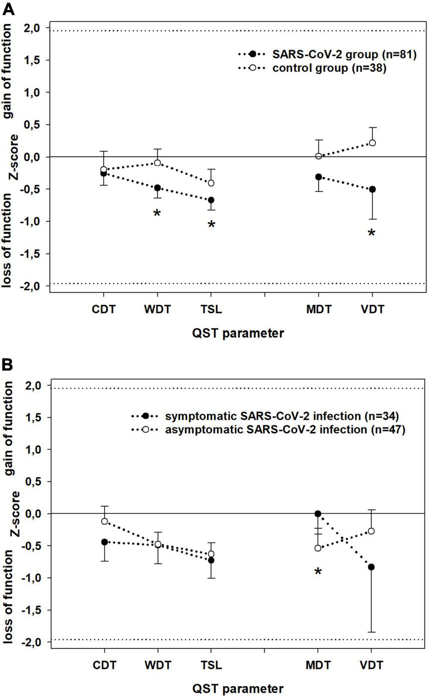 Detection thresholds at dorsal feet (z-score; mean ± SD) assessed by Quantitative Sensory Testing in (A) patients (black) vs. controls (white) and (B) patients with symptomatic (black) vs. patients with asymptomatic (white) SARS-CoV-2 infection. Parameters assessing the small (WDT; CDT; TSL) and large (VDT, MDT) fibre function have been separately linked by dotted lines for better visualisation. Z-values between –1.96 and 1.96: normal range of healthy subjects. Z-values > 0: gain of sensory function, z-values < 0: loss of sensory function. CDT, cold detection threshold; WDT, warm detection threshold; TSL, thermal sensory limen; MDT, mechanical detection threshold; VDT, vibration detection threshold. Significant differences (P < 0.05) are marked with *.