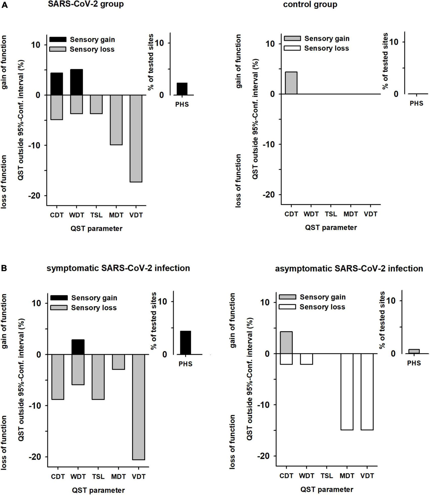 Abnormal values of sensory parameters in (A) patients vs. controls and (B) patients with symptomatic vs. patients with asymptomatic SARS-CoV-2 infection. QST values outside the 95% confidence interval (95% CI) of the reference data base (13). The y-axis shows percentage of subjects, with positive sensory signs mapped upward (gain of sensory function) and negative sensory signs mapped downward (loss of sensory function). (A) Patients n = 82, Controls n = 38. (B) Patients with symptomatic SARS-CoV-2 n = 35, Patients with asymptomatic SARS-CoV-2 n = 47. Absence of paradoxical heat sensations (PHS) is normal, so there are no negative signs for PHS. QST, quantitative sensory testing; CDT, cold detection threshold; WDT, warm detection threshold; TSL, thermal sensory limen; MDT, mechanical detection threshold; VDT, vibration detection threshold; PHS, paradoxical heat sensations.