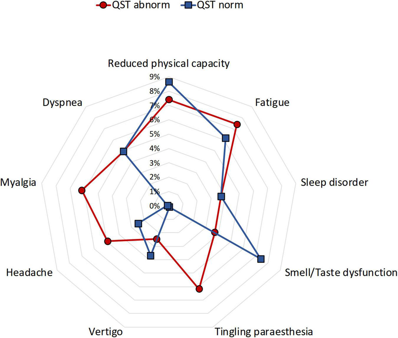 Distribution of frequent post-COVID complaints in children and adolescents with and without abnormal QST. QST, quantitative sensory testing. Normal QST (blue), abnormal QST (red).