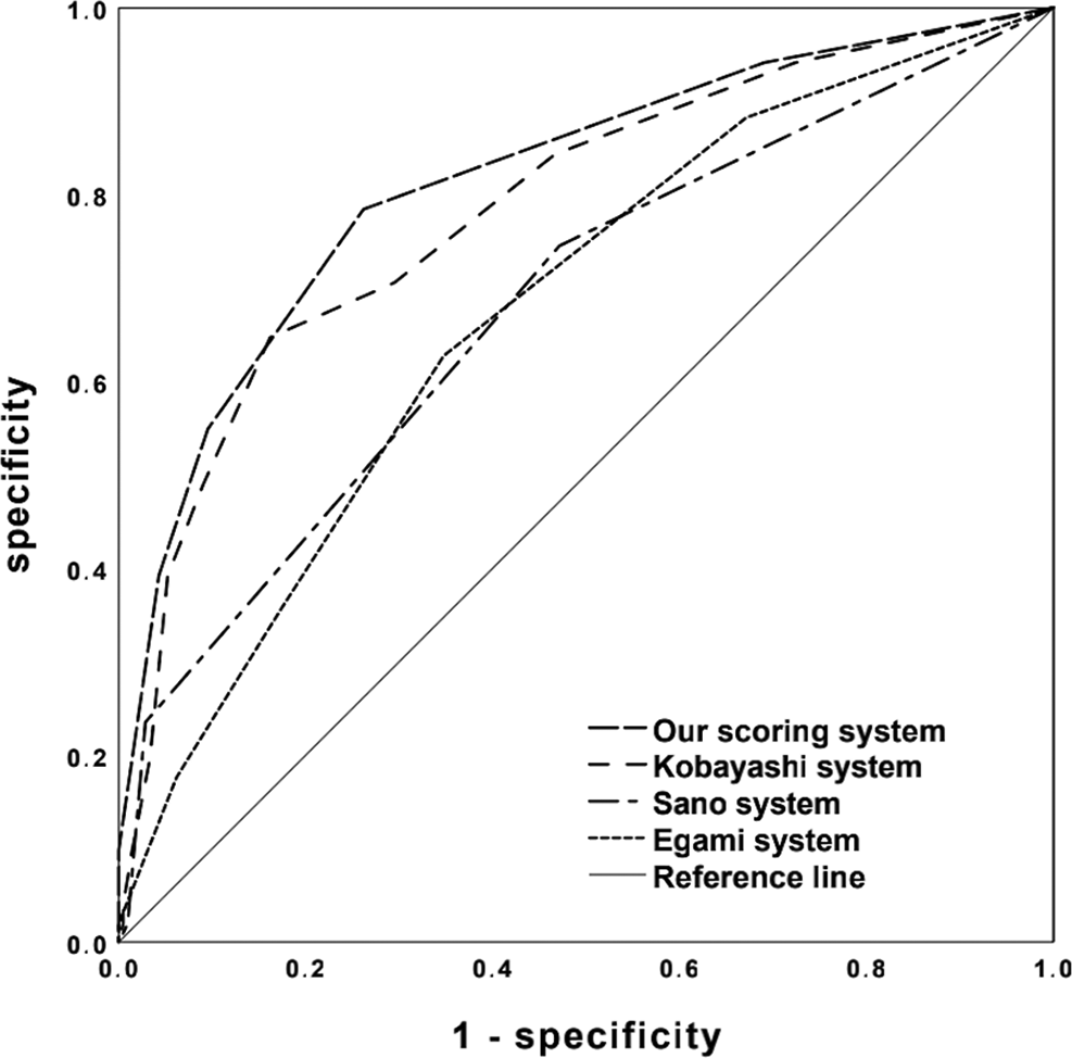 ROC curves of the new simple scoring model, Kobayashi, Egami, and Sano scoring systems in predicting IVIG non-responsiveness.