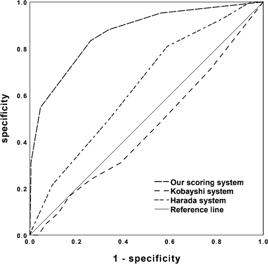 ROC curves of the novel simple scoring model, Kobayashi and Harada scoring systems in predicting CALs development.