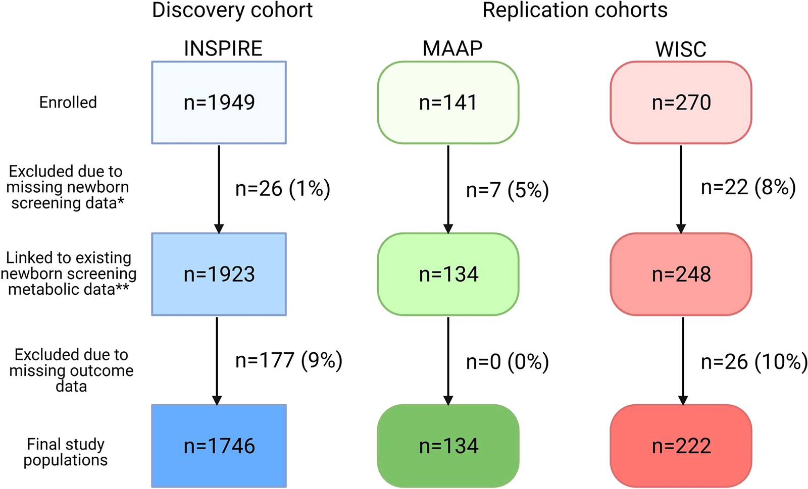 Our final study populations included 1,746 (INSPIRE, discovery cohort), 134 (MAAP, replication cohort), and 222 (WISC, replication cohort) infants after linking NBS metabolic data to >90% of infants (Figure 1). Demographic and clinical characteristics and NBS metabolite concentrations for the study populations are shown in Table 1 and Supplementary Table S3.