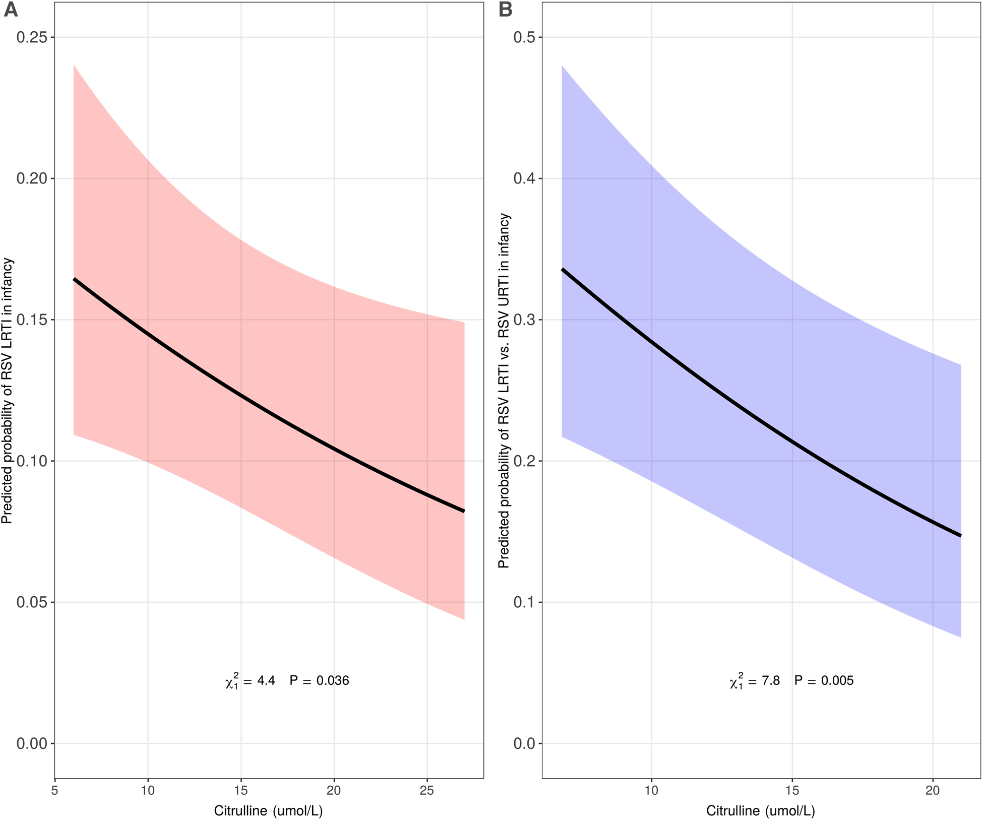 Figure 2. Association of citrulline concentration at birth with lower respiratory tract infection (LRTI) of all etiologies (panel A, n = 1746) and respiratory syncytial virus (RSV) LRTI (panel B, n = 912) in infancy in the discovery cohort. The predicted probability (y-axis) in panel A was calculated using a multivariable logistic regression model in the discovery cohort, INSPIRE, adjusting for infant sex, infant race/ethnicity, mode of delivery, maternal smoking during pregnancy, ever breastfed, maternal asthma, living siblings, daycare attendance during the first year of life, and all other identified metabolites (C2, C3, C5, C5:1, C6-DC, C10:1, C10:2, C16, C18:2, ASA, GLY, ORN, SUAC, and VAL). The predicted probability (y-axis) in panel B was calculated using a multivariable logistic regression model in a subset of infants in INSPIRE with either RSV upper respiratory tract infection (URTI, less severe) or RSV LRTI (more severe), adjusting for infant sex, infant race/ethnicity, mode of delivery, maternal smoking during pregnancy, ever breastfed, maternal asthma, living siblings, and daycare attendance during the first year of life.