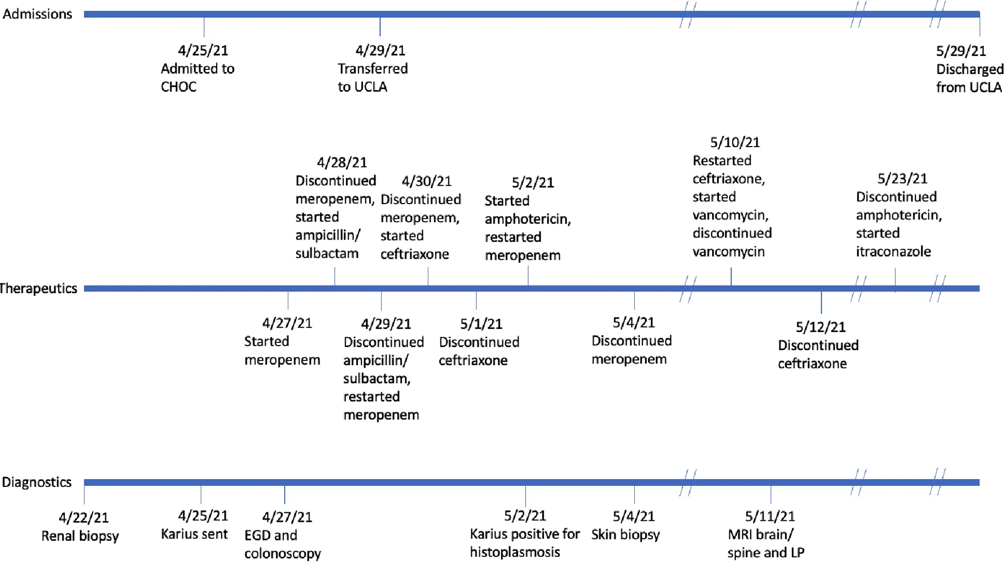Given fever after GI biopsies, the patient was started on meropenem (unknown dosage) empirically on 4/27, which was eventually transitioned to ampicillin/sulbactam (unknown dosage) on 4/28 after serum bacterial cultures did not demonstrate any growth. On transfer to UCLA on 4/29, ampicillin/sulbactam was discontinued and meropenem 1 g every eight hours was initiated and administered from 4/29 to 4/30 and 5/2-5/4 given continued clinical instability. During the course of empiric treatment and prior to diagnosis of histoplasmosis, he also received intermittent ceftriaxone 1 g daily (4/30-5/1, 5/10-5/12) and one dose of vancomycin 750 mg on 5/10. The patient was eventually started on liposomal amphotericin B 4 mg/kg daily, given findings consistent with disseminated histoplasmosis. Twenty-two days of IV liposomal amphotericin B were completed prior to transitioning to oral itraconazole therapy 200 mg twice daily. Itraconazole was increased to 300 mg PO twice daily two months later due to low trough levels; the patient was maintained therapeutic itraconazole levels on this dose thereafter.
