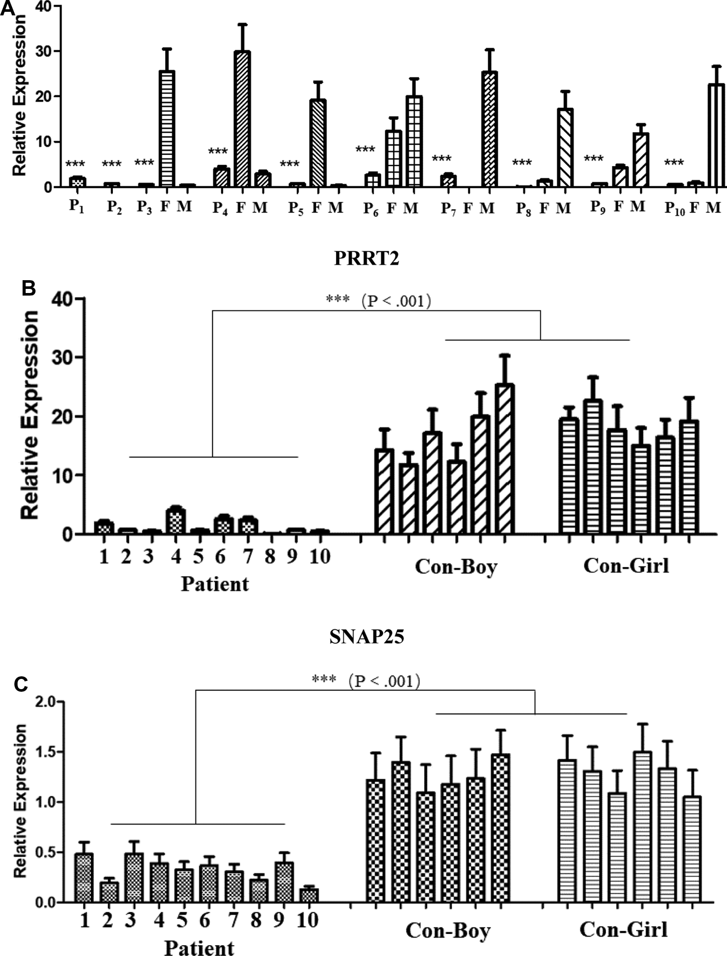 Quantitative polymerase chain reaction (qPCR) analysis of proline-rich transmembrane protein 2 (PRRT2) and synaptosome-associated protein 25 (SNAP25) gene expression. P1–P10, patients 1–10; F, father; M, mother; CON-Boy, control boys; CON-Girl, control girls. (***P ≤ 0.001). PRRT2 expression level in (A) patients and their parents and (B) patients and control children of the same age. (C) SNAP25 expression level in patients and control children of the same age.