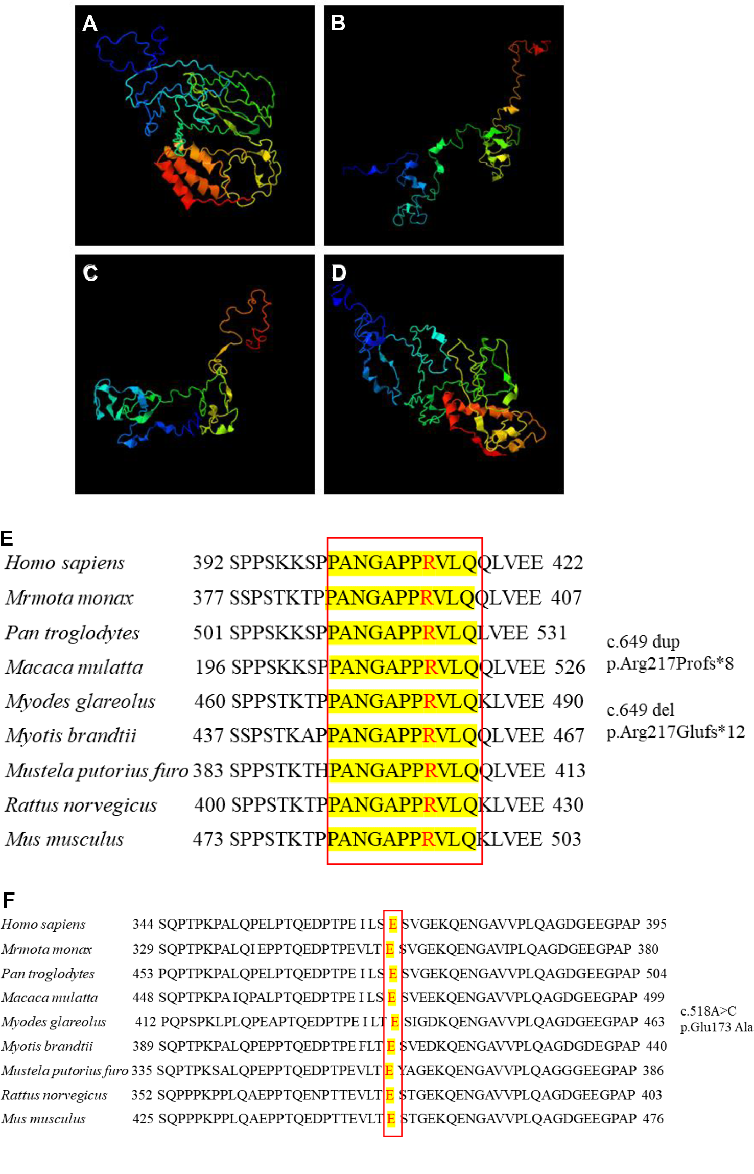 Three-dimensional structure of proline-rich transmembrane protein 2 (PRRT2). (A) Wild-type protein. Frameshift mutation (B) c.649 dup and (C) c.649 del. (D) Missense mutation c.518A > C. Conservation studies of (E) c.649 and (F) c.518 on Homo sapiens, Marmota monax, Pan troglodytes, Macaca mulatta, Myodes glareolus, Myotis brandtii, Mustela putorius furo, Rattus norvegicus, and Mus musculus.