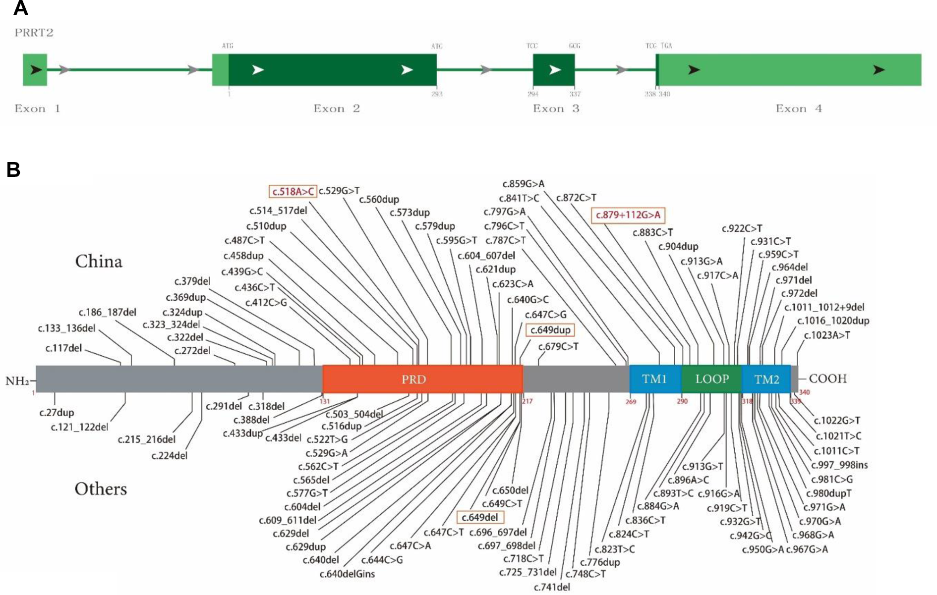 Schematic diagram of proline-rich transmembrane protein 2 (PRRT2) mutation map and protein domain superposition. (A) PRRT2 is composed of four exons, exons 2–4 encode multidomain protein containing 340 amino acids. (B) Main domains of PRRT2 protein: PRD (orange, 131–216), proline-rich domain; TM1 (blue, 269–289), transmembrane domain 1; TM2 (blue, 318–338), transmembrane domain 2; Loop (green, 290–317), domain between TM1 and TM2. Text box shows mutations reported in this article, where red font indicates new mutation.