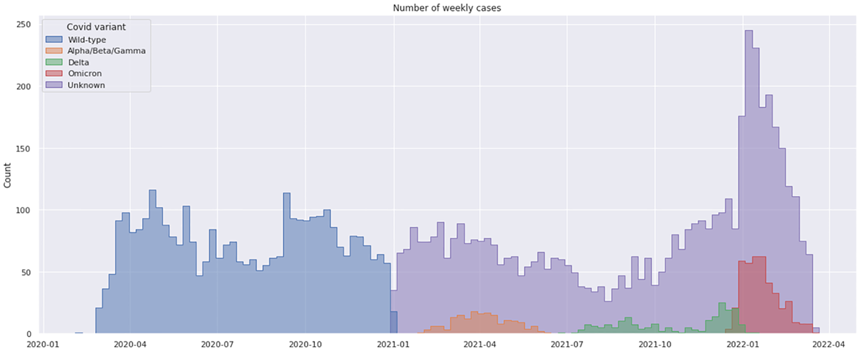 The blue and violet bars represent the number of cases; the orange, green, and red bars represent the alpha-beta-gamma, delta, and omicron detected genotyping, respectively. For the first wave period (March 2020- Dec 2020) the genotyping was assigned to the historical variant (wild type).