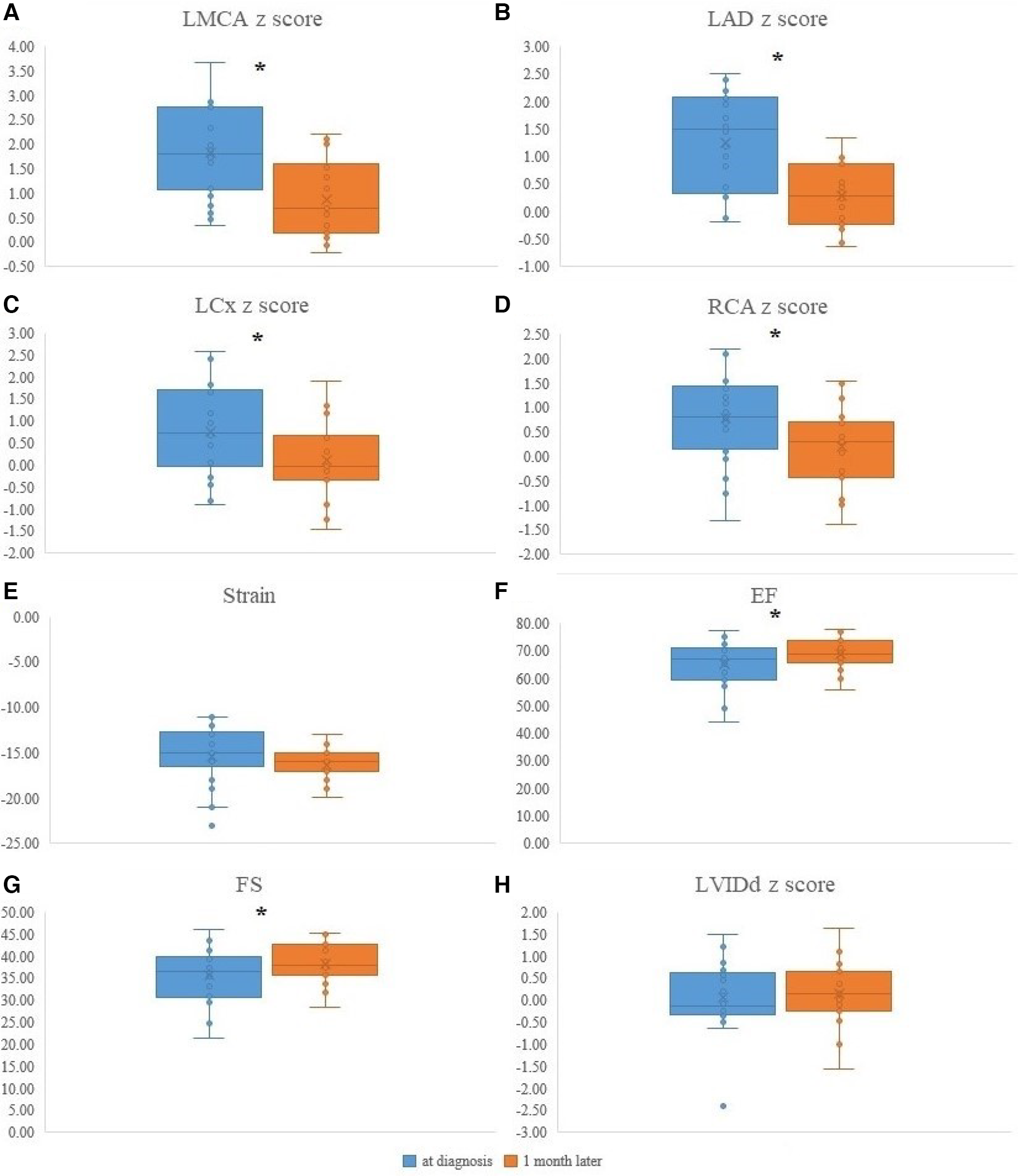 The Philips IE33 system (Phillips Medical Systems, Andover, MA, USA) was used for echocardiography. A pediatric cardiologist (J.Y.) performed the echocardiography, and three-cycle loop heartbeats were recorded. Transducers were chosen based on the patient's physical development. Due to race similarity, the z-scores of coronary arteries were calculated based on the study of Kobayashi et al. (14). The diastolic left ventricular internal diameter (LVIDd) z-scores were calculated using the method published by Patterson et al. (15).