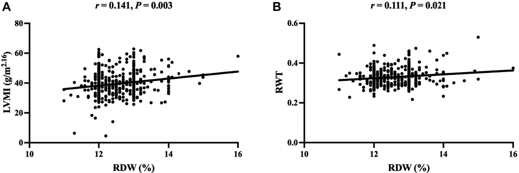 Scatter plot of correlation between RDW and LVMI (A), RWT (B). RDW, red blood cell distribution width; LVMI, left ventricular mass index; RWT, relative wall thickness.