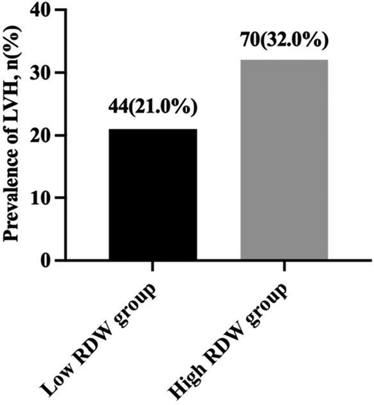 The results of complete blood count showed that, compared with the non-LVH group, the RBC count and hematocrit level in the LVH group were significantly higher. Most importantly, the level of RDW in the LVH group was higher than that in the non-LVH group (13.0 [12.0, 13.0] vs. 12.4 [12.0, 13.0] %, P = 0.001). In other variables of complete blood count analysis, including white blood cells (WBCs), did not significantly differ between the LVH group and non-LVH group (Table 3).