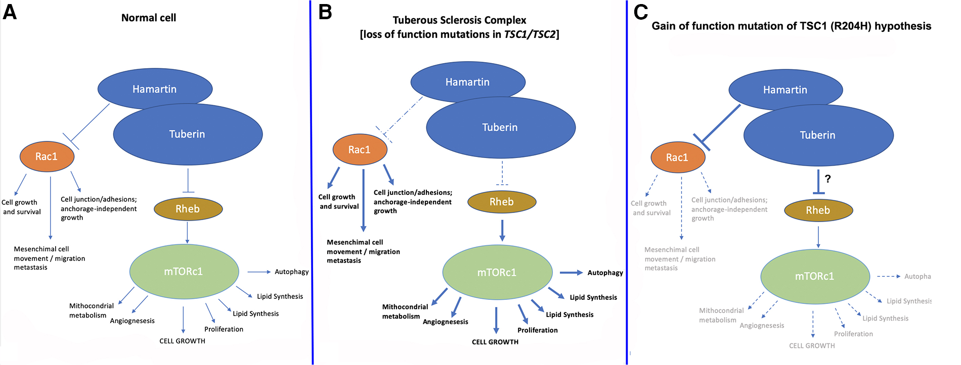 To the best of our knowledge, no “hyperactivating” [i.e., gain-of-function] mutations of TSC1 or TSC2 have been reported to date in individuals with TSC; other diseases caused by mutation of genes involved in the synthesis of downstream effectors of TSC1 and TSC2 have been reported in recent years, including a neurocutaneous phenotype caused by RHOA inactivation and other clinical entities due to Rac1 inactivation, which present with under- or over-growth of the brain depending on the residual function of the protein involved (7–10).