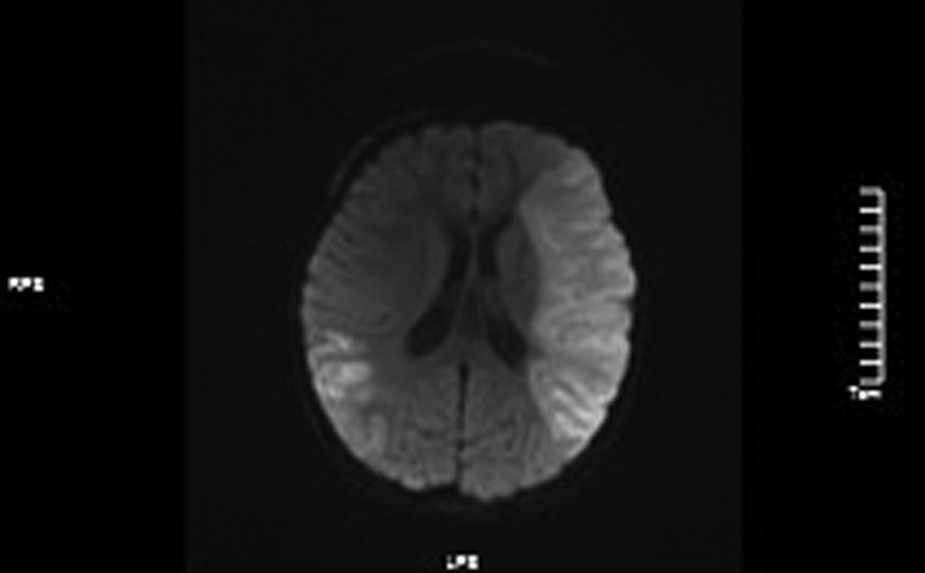 MRI: (1). acute massive cerebral infarction in the left frontal lobe and bitemporoparietal occipital lobe.