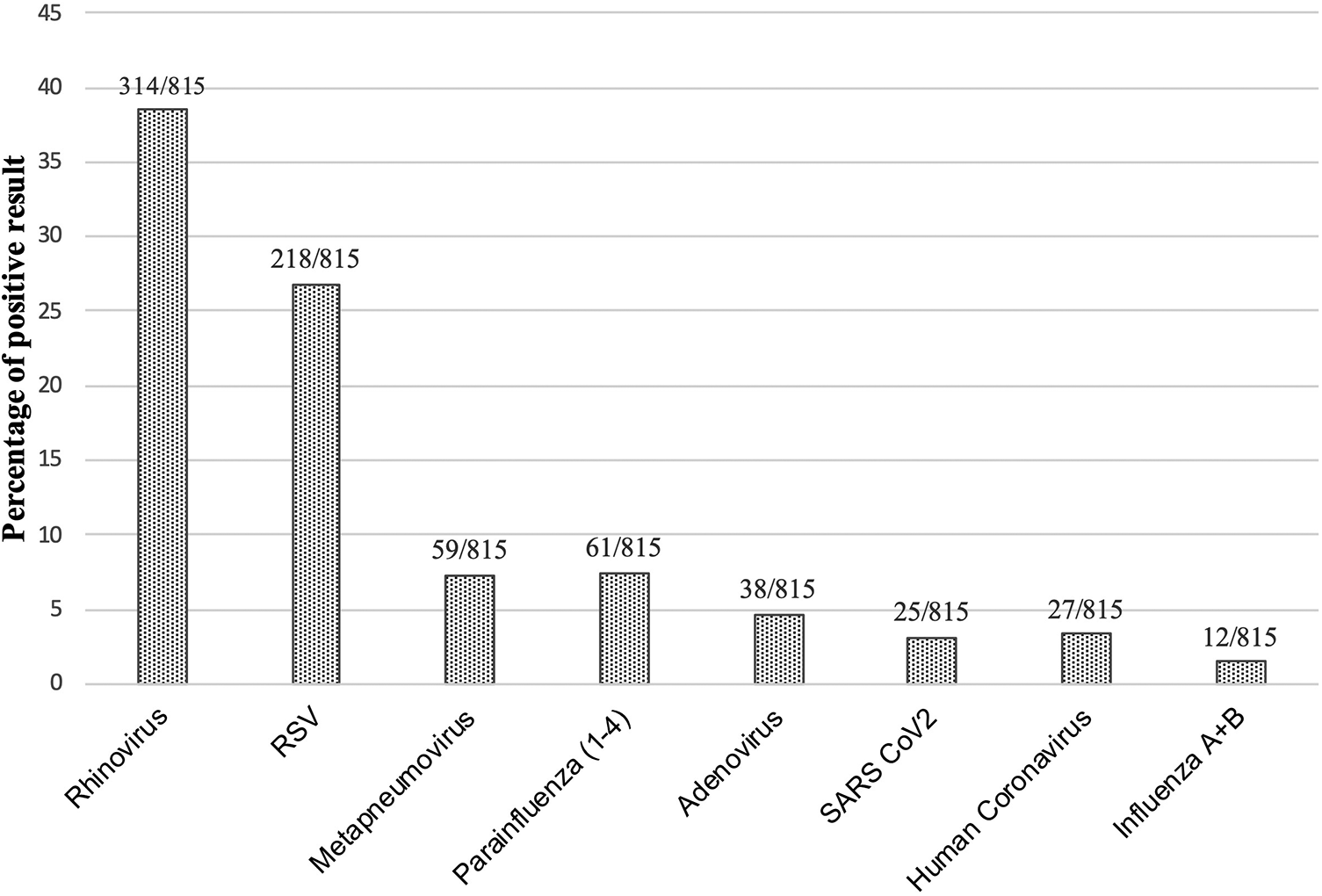 The most common pathogen was rhinovirus (n = 314/815, 39%), followed by RSV (n = 218/815, 27%), metapneumovirus (n = 59/815, 7%), parainfluenza viruses (1–4) (n = 61/815, 7%), adenovirus (n = 38/815, 5%), and SARS CoV2 (n = 25/8,153%) (Figure 1). The influenza virus was sporadic. The other tested pathogens, such as Bordetella pertussis, were not detectable throughout the winter season.