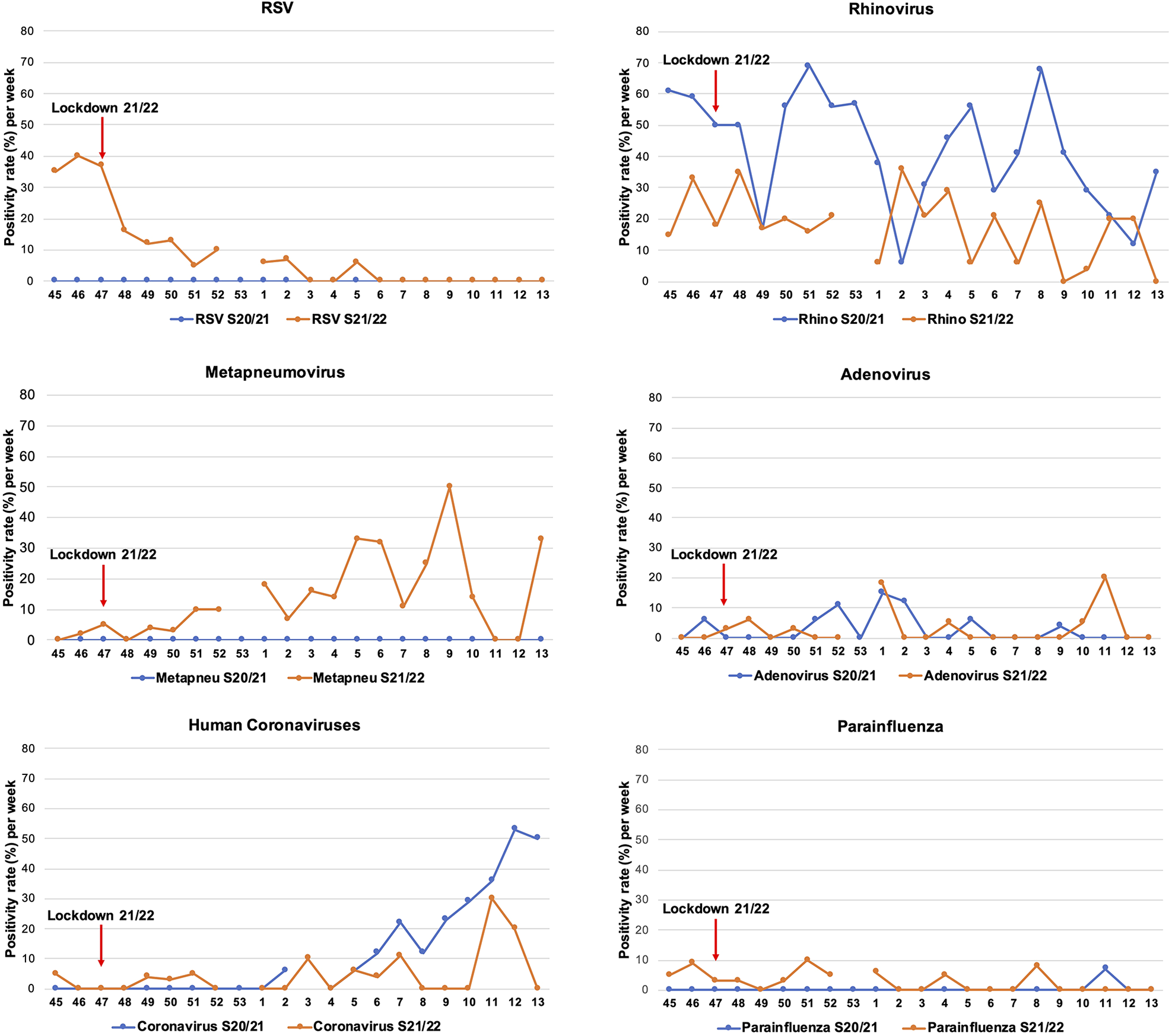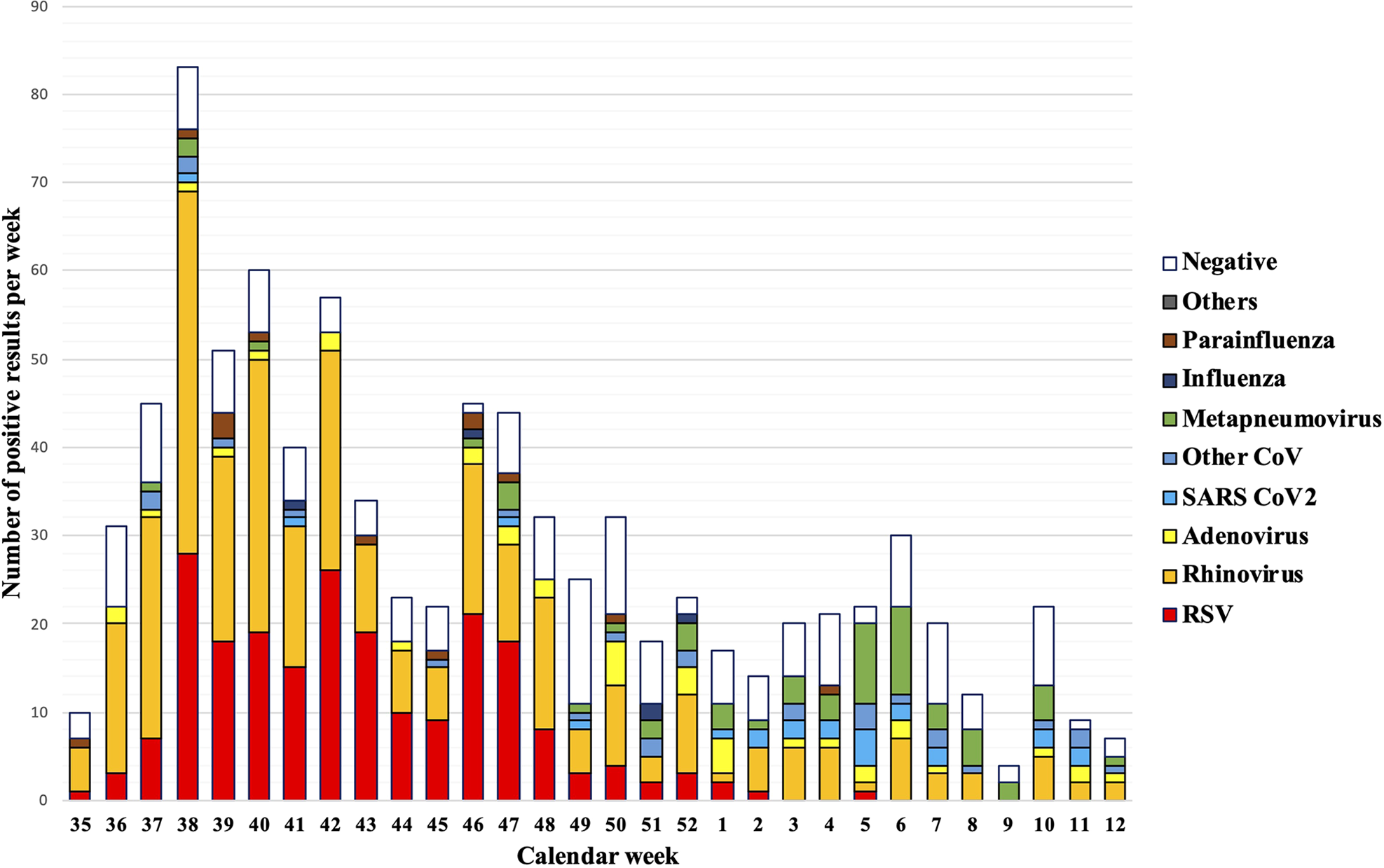 Before the Covid-19 pandemic, RSV, influenza, and human coronavirus followed a certain seasonality, typically starting between November and December in the northern hemisphere (5–7). Since the emergence of SARS CoV2, drastic measures have been adopted worldwide to prevent the virus from spreading. There were recommendations for lockdowns, social distancing, hand hygiene, and mouth and nose protection, which curbed the Covid-19 pandemic and the occurrence of other respiratory pathogens. In a longitudinal study we conducted in the first Covid-19 winter season (2020/2021), we were able to determine the absence of RSV, metapneumovirus, or influenza in a pediatric cohort with acute respiratory infections (0–24 months). In contrast, rhinoviruses, adenoviruses, and human coronaviruses continued to appear and were in part influenced by the Covid-19 measures (lockdown) (8). Similar results have been confirmed in other countries and by the Surveillance Network data (9–12). German children were spared from influenza, metapneumovirus and RSV, whereas rhino/enterovirus and adenovirus were still circulating through the pandemic (11). According to Australian and English data, a dramatic impact of the Covid-19 measures was observed for influenza and RSV (10, 12). However, the RSV activity increased after removal of local Covid-19 restrictions and after relaxation of Australian state borders (10).