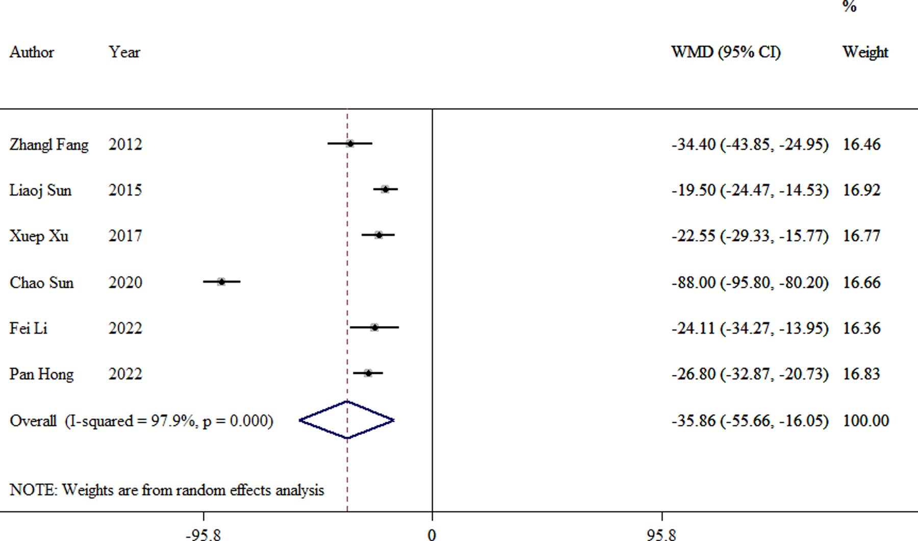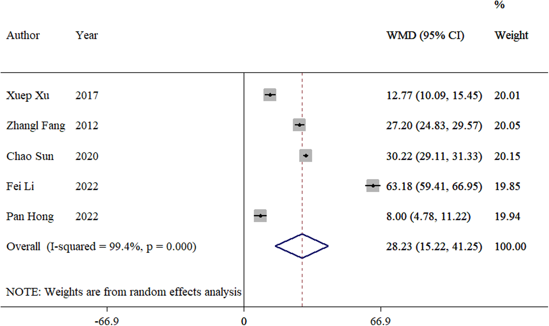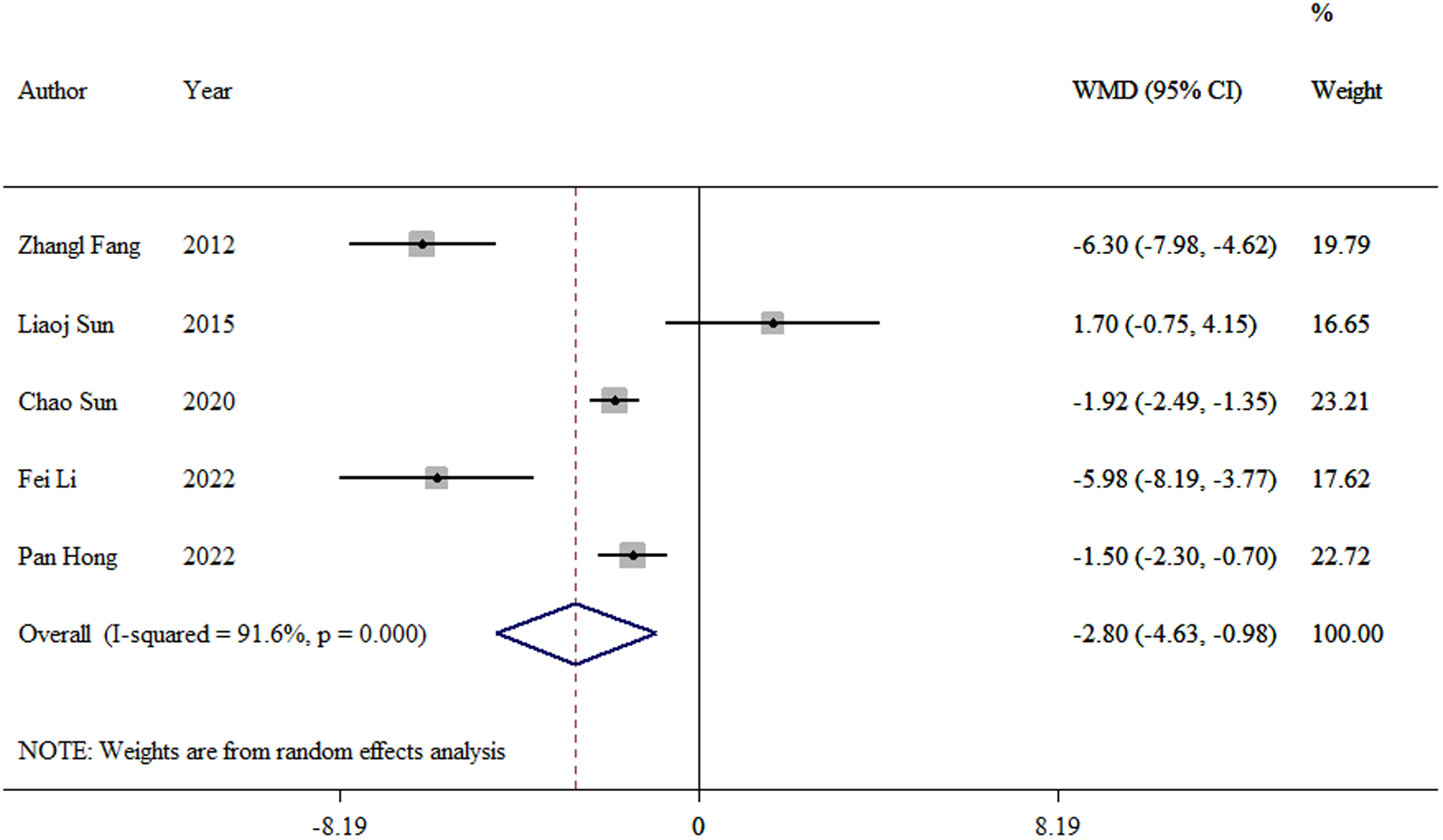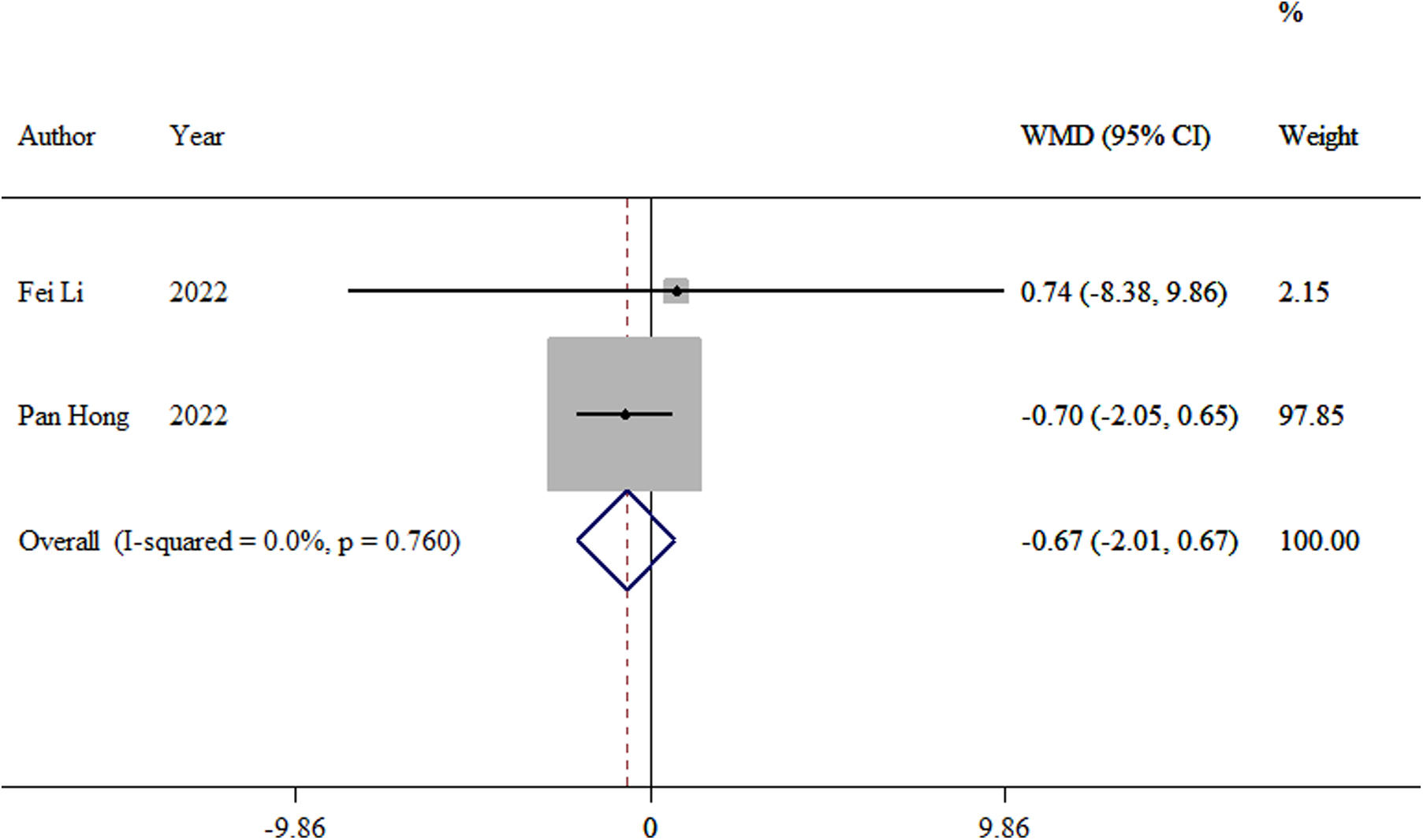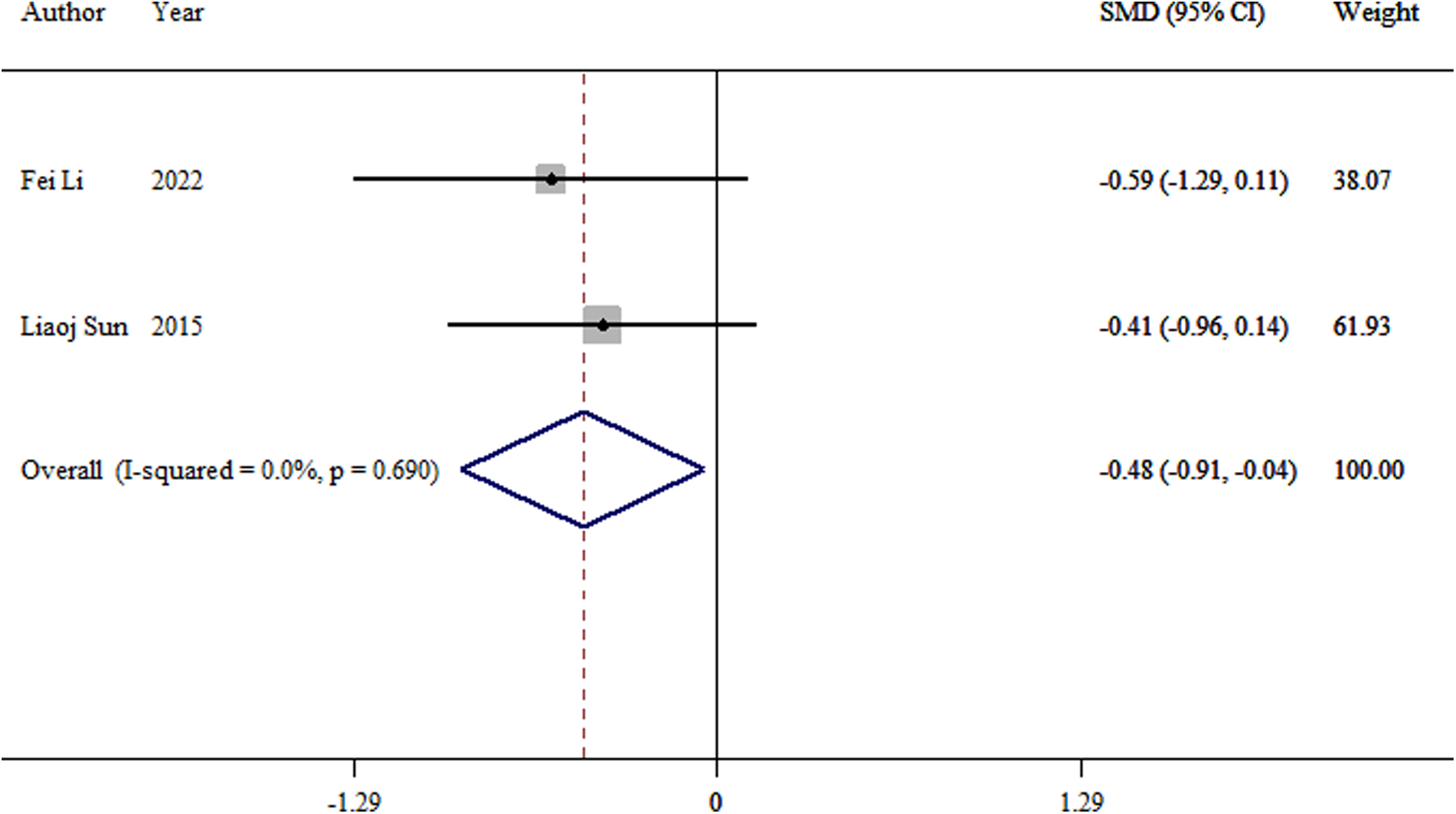 Stata version 14.0 was used for data analysis, weighted mean difference (WMD) was used as the effect size for continuous variables, standardized mean difference (SMD) was used as the effect size for different units, and odds ratio (OR) was used as the effect size for dichotomous variables. When p < 0.1 or I2 > 50% were considered to have significant heterogeneity, a random-effects model was used for statistical analysis; p > 0.1 or I2 < 50% were considered to have less heterogeneity, and a fixed-effects model was used for statistical analysis. Sensitivity analysis was performed to confirm the stability of the study results, and Egger's test was used to analyze publication bias when ≥5 studies were included, with a test level of α = 0.05.