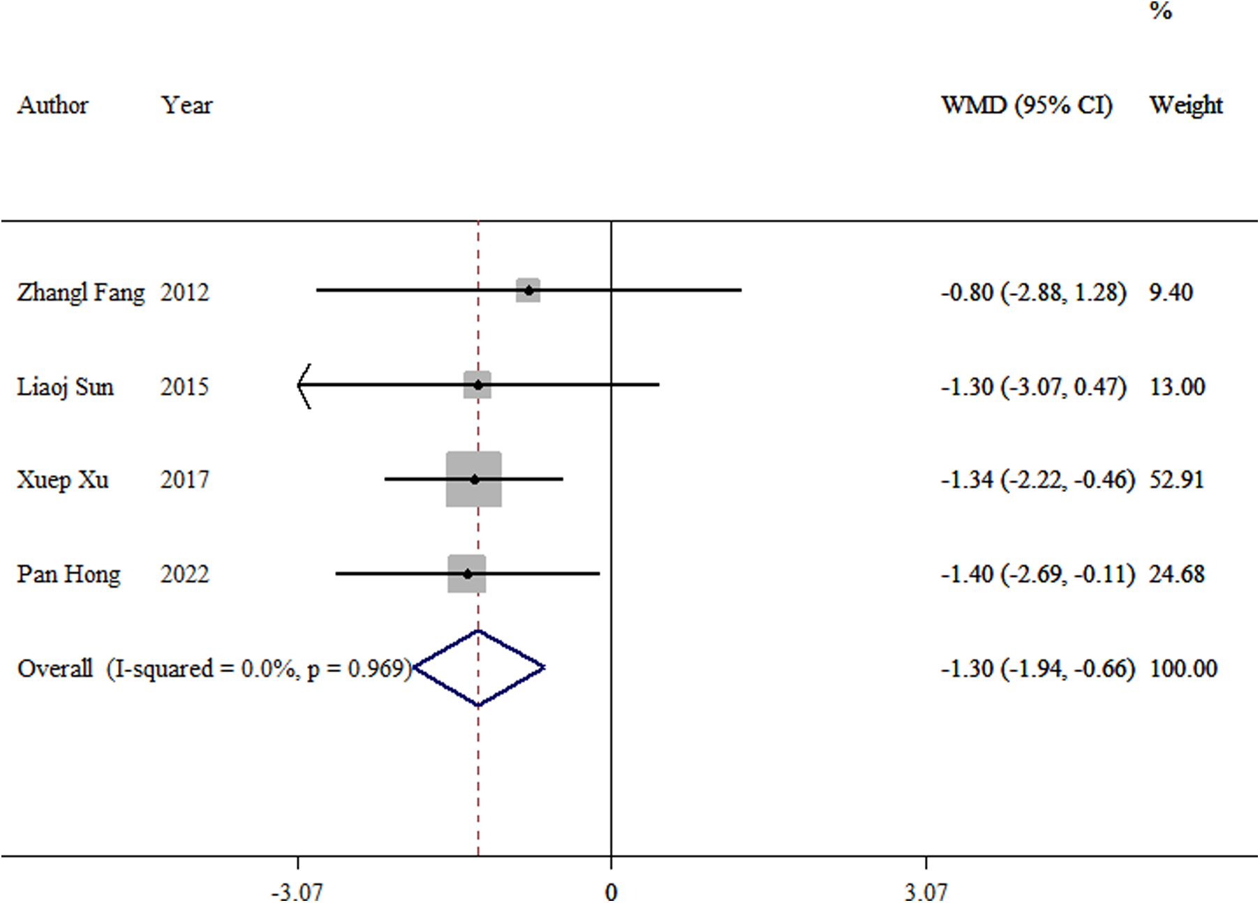 Four studies (8, 10, 13, 16) were incorporated into the analysis. The meta-analysis showed a significant difference between the TEN and LP groups (WMD = −1.30, 95% CI: −1.94–0.66; p < 0.01; Figure 6).