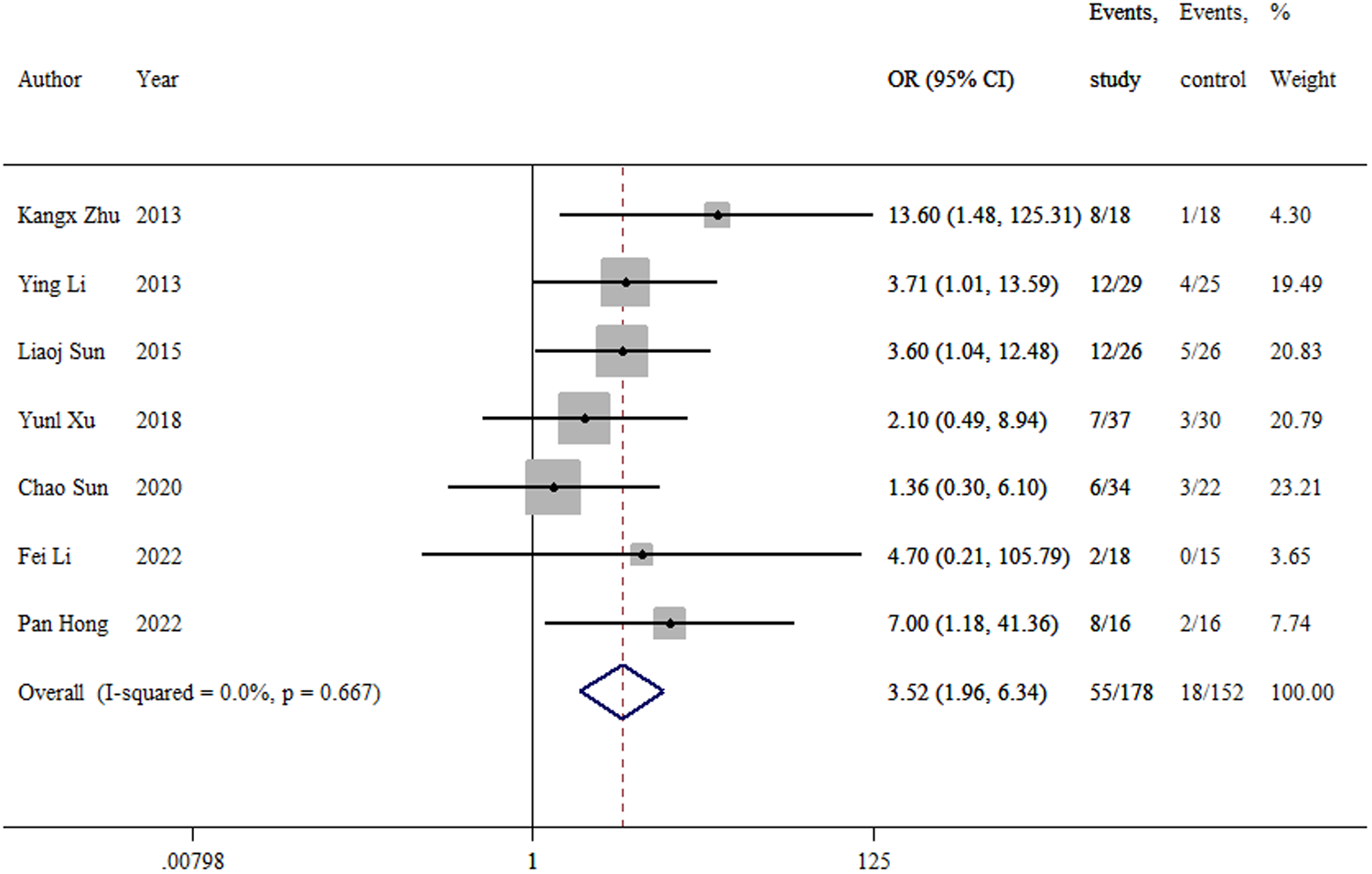 Seven studies (9–12, 14–16) reported postoperative rotational angular deformity. The meta-analysis showed a significant difference between the TEN and LP groups (OR = 3.68, 95% CI: 1.40–9.68; p = 0.008; Figure 10A). The incidence was 10.5% in the TEN group and 2.6% in the LP group.