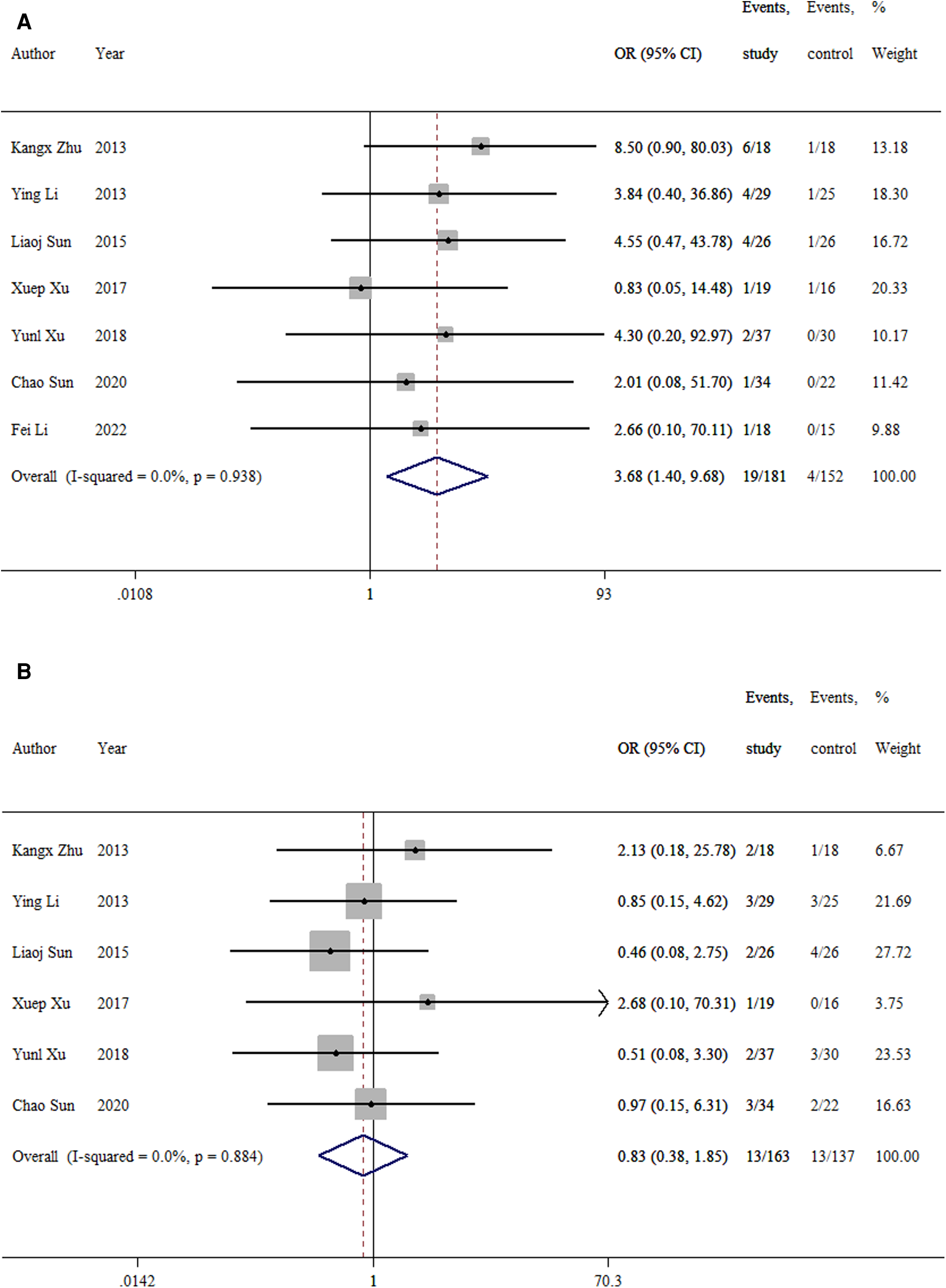 Figure 10. Forest plot of the meta-analysis of major complications. (A) rotational, angular, and valgus deformity; (B) lower extremity inequality.