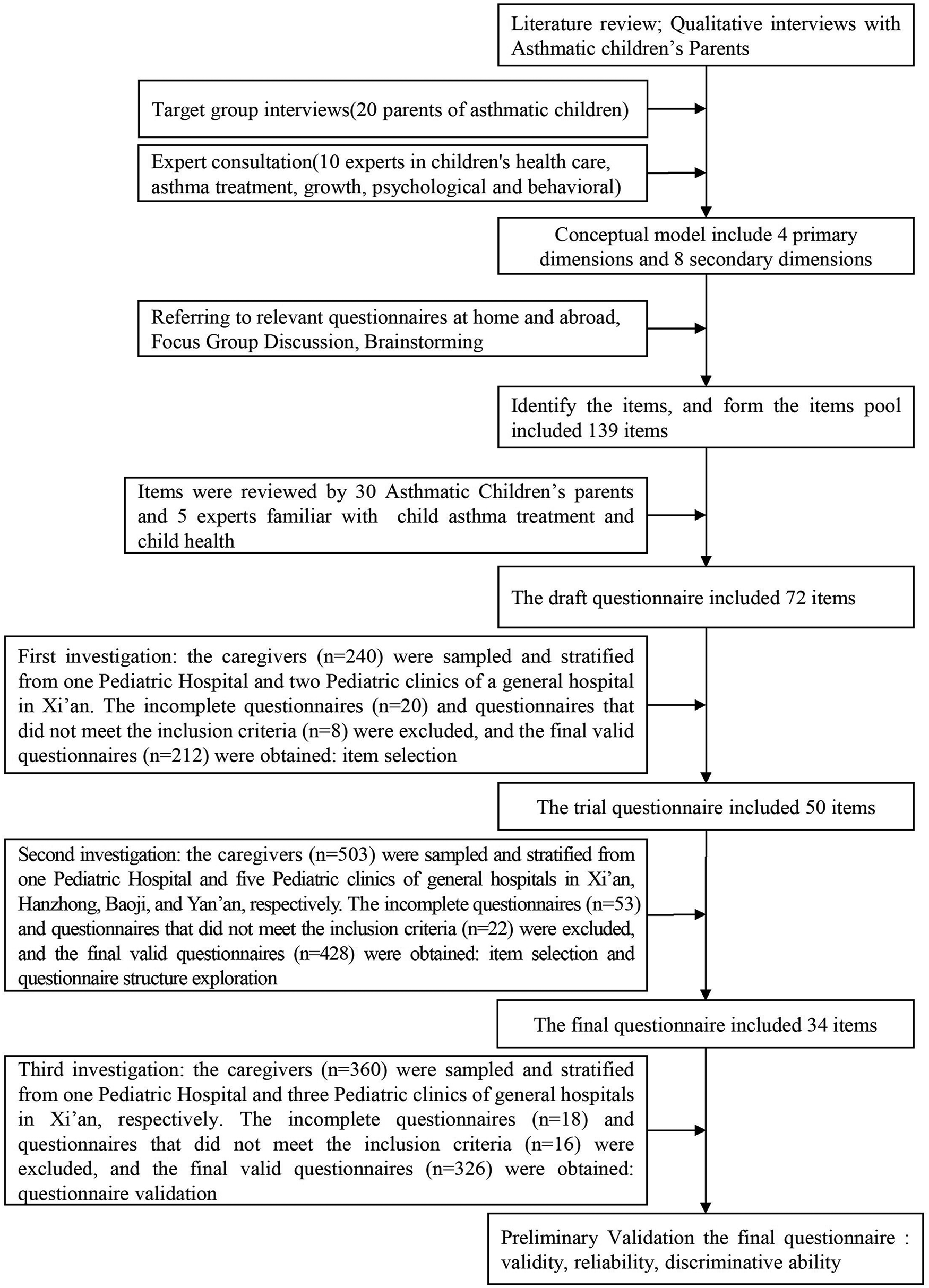 The flowchart of the research process of development and preliminary validation of patient reported outcomes questinnaire od children with asthma in China: A caregiver's proxy-reported measure.