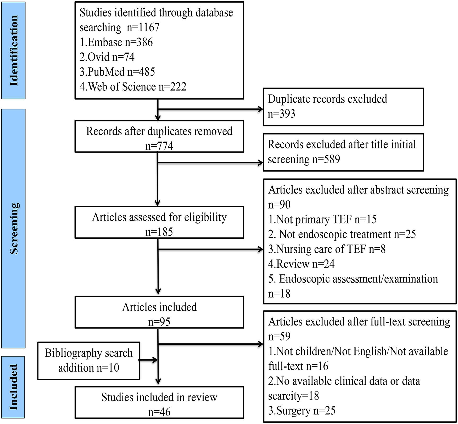 Inclusion criteria: (1) literature with diagnosed tracheoesophageal fistula cases; (2) literature detailing endoscopic interventional techniques for TEF; (3) literature reporting outcomes and prognosis after endoscopic treatment of children with TEF; (4) cases in children; (5) literature published in peer-reviewed publications; (6) literature in only the English language. Exclusion criteria: (1) surgical repair treatment; (2) non-pediatric cases; (3) those on whom no clear endoscopic treatment intervention technique was performed or those who were subjected to only endoscopic examination and evaluation or were provided assistance in treatment; (4) literature related only to postoperative TEF nursing care records or anesthesia technique; (5) literature related to animal research; (6) literature with missing or incomplete clinical data. Studies that fulfilled the criteria regardless of the different types (although always > 1) of endoscopic interventional therapy, the number of participants, and the outcome of treatment were eligible for inclusion in the review process.