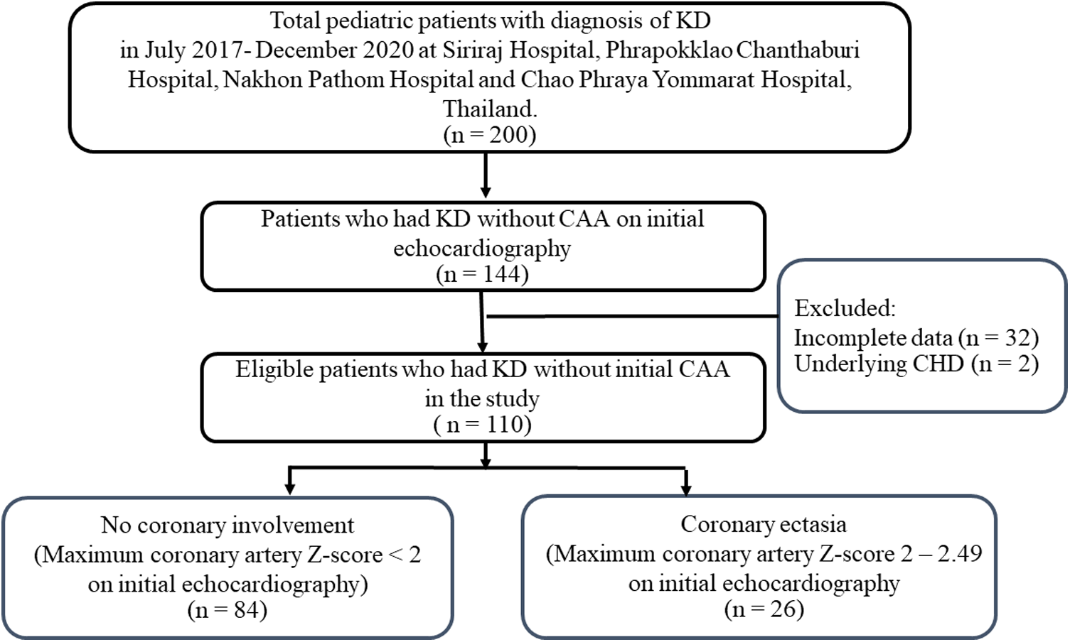 In low-income countries, frequent echocardiographic assessments can lead to high costs or risks for sedated patients. In a retrospective trial of the cost-effectiveness of echocardiography in 1999, all children with KD were recommended to have an echocardiography at the time of diagnosis with a follow-up study four to eight weeks after the onset of fever (15). We hypothesized that coronary arteries in patients without initial CAA and that remained normal at eight-weeks follow-up did not progress to CAA or require further intervention. Considering the prior studies that were conducted in different settings and among different ethnic groups, we undertook this multicenter retrospective study of patients diagnosed with KD without initial CAA (Z-score < 2.5). Our aim is to evaluate changes in the coronary artery Z-scores and occurrences of major adverse cardiac events from the initial diagnosis, to two weeks, eight weeks, and at one year following diagnosis.
