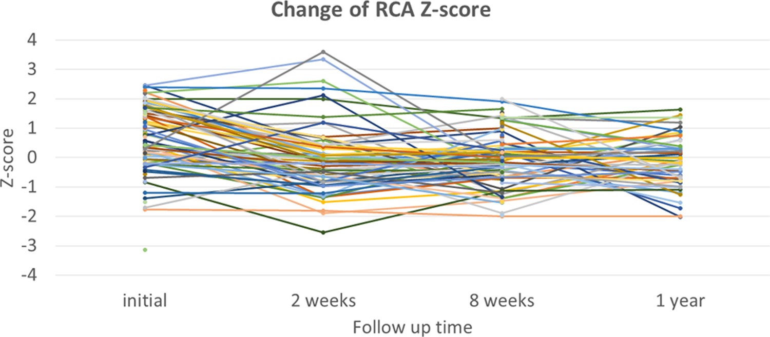 Changes in Z-scores for the right coronary artery (RCA) at each time point.