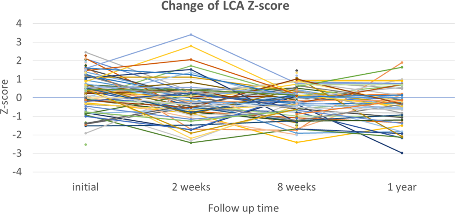 Changes in Z-scores for the left main coronary artery (LCA) at each time point.