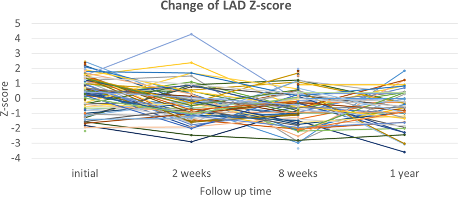 Changes in Z-scores for the left anterior descending artery (LAD) at each time point.