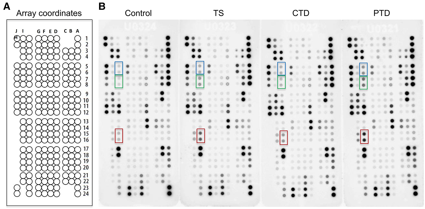 Figure 1. Cytokine array analysis of plasma from patients with tic disorders and healthy controls. (A) Schematic diagram of cytokine array coordinates representing 105 different capture antibodies printed in duplicate. (B) Array results for control subjects, and TS, CTD, and PTD patients. Dots representing CCL5, PDGF-AA, and PDGF-AB/BB are highlighted in red, blue and green, respectively.