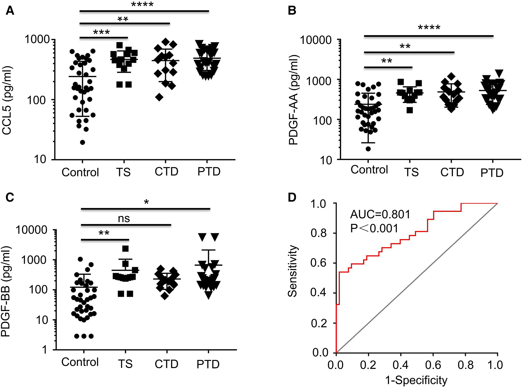 Figure 3. Plots showing the levels of plasma CCL5, PDGF-AA, and PDGF-BB. Plots showing the levels of plasma CCL5 (A), PDGF-AA (B), and PDGF-BB (C) from healthy controls and TD patients (TS, CTD, PTD. (D) ROC curve analysis combining CCL5 in the differential diagnosis between TD and normal. ROC, receiver operating characteristic; AUC, area under the curve.