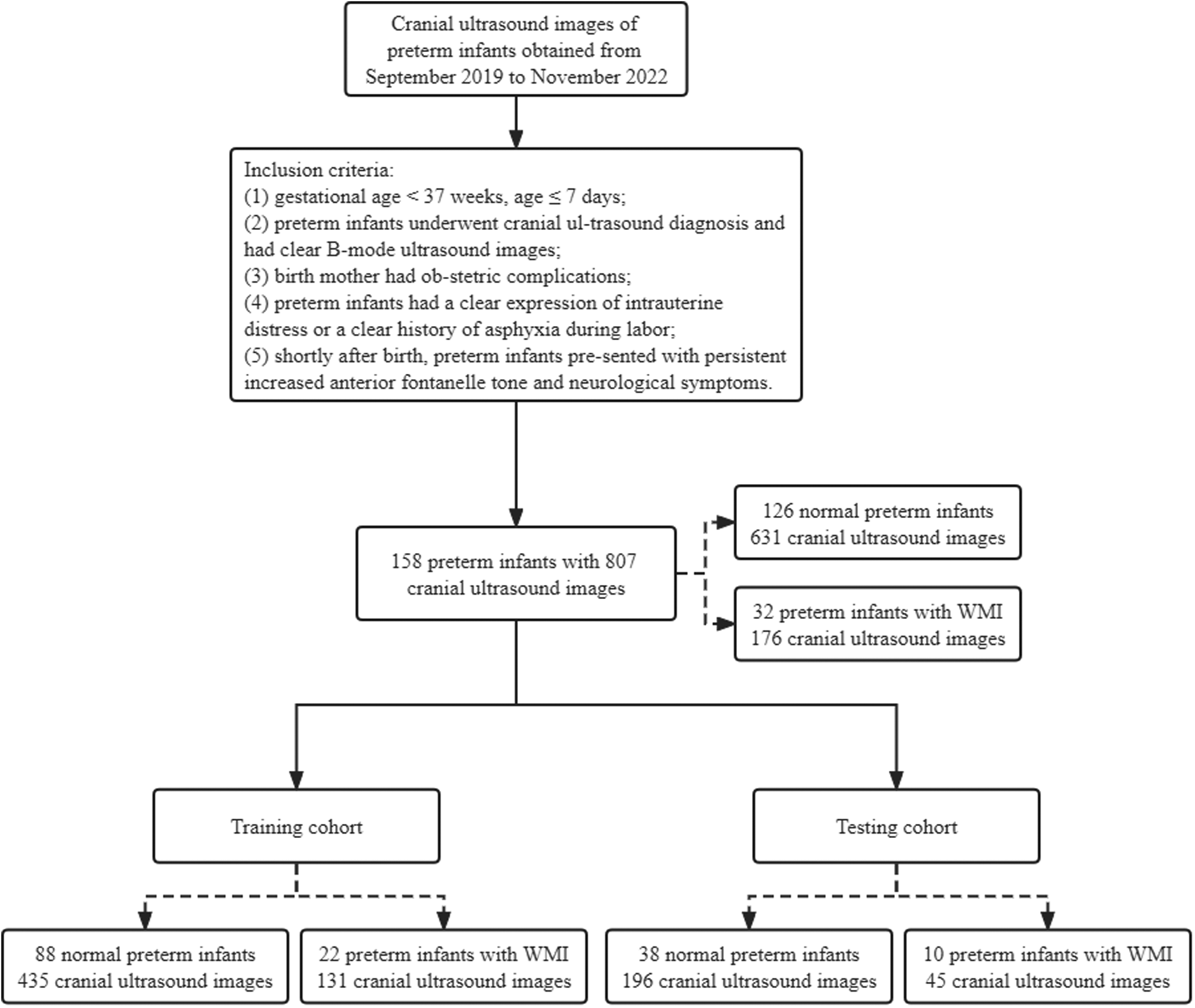 The study population consisted of 158 preterm infants with 807 cranial US images. 126 cases in the data set were normal preterm infants and 32 cases were preterm infants with WMI. We split the data set into training cohort (110 preterm infants with 566 cranial US images) and testing cohort (48 preterm infants with 241 cranial US images) at a ratio of 7:3. Figure 1 presents an overview of the patients of the study. The training cohort consists of 88 normal preterm infants (435 cranial US images) and 22 preterm infants with WMI (131 cranial US images). The testing cohort consists of 38 normal preterm infants (196 cranial US images) and 10 preterm infants with WMI (45 cranial US images).