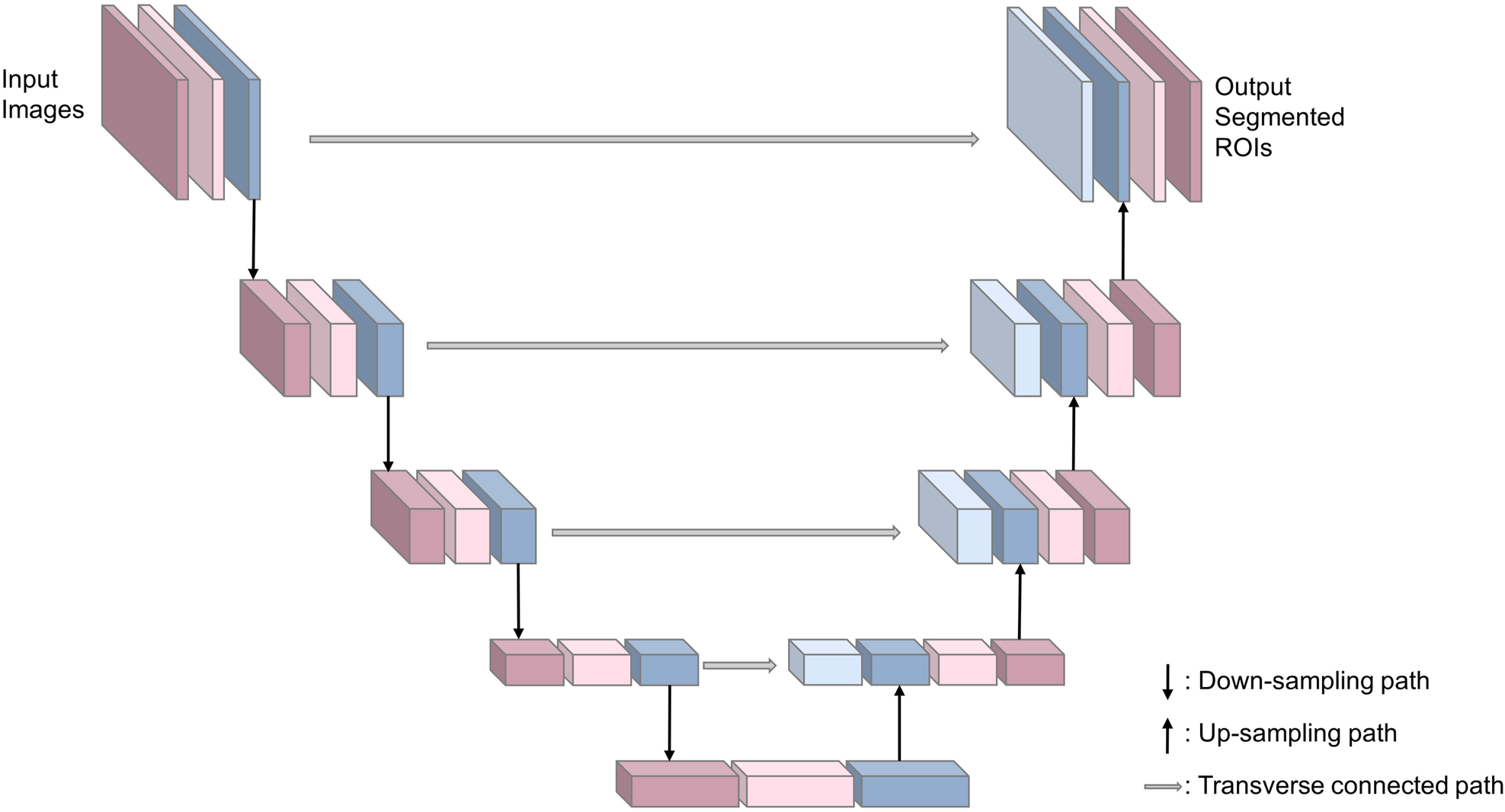 In order to find the most suitable segmentation deep learning network (SDL-Net), we compared FCN (21), U-Net (22), TransUNet (23) and Swin-Unet (24) for white matter segmentations. Based on the result of this ablation experiment (detailed in Supplementary Material), we used U-Net as our SDL-Net. U-Net is an improved segmentation network based on FCN (21) that uses only a small amount of data to train an end-to-end (image in, image out) network and works well for medical images. U-Net network includes a down-sampling path for capturing semantic information, an up-sampling path for accurate segmentation localization, and a transverse connected path. The structure is shown in Figure 3. The down-sampling path is used to extract features of the image at different scales. The up-sampling path is symmetric to the down-sampling path, and they form a U-shaped structure. The transverse connected path allows the network to propagate information of the original image directly to the higher level of high-resolution layer. This structure makes the output layers of the whole network with no missing context information comparing with the original images, and allows U-Net to be used for segmentation of small datasets and reduce the memory limitation of the graphics processing unit (GPU).