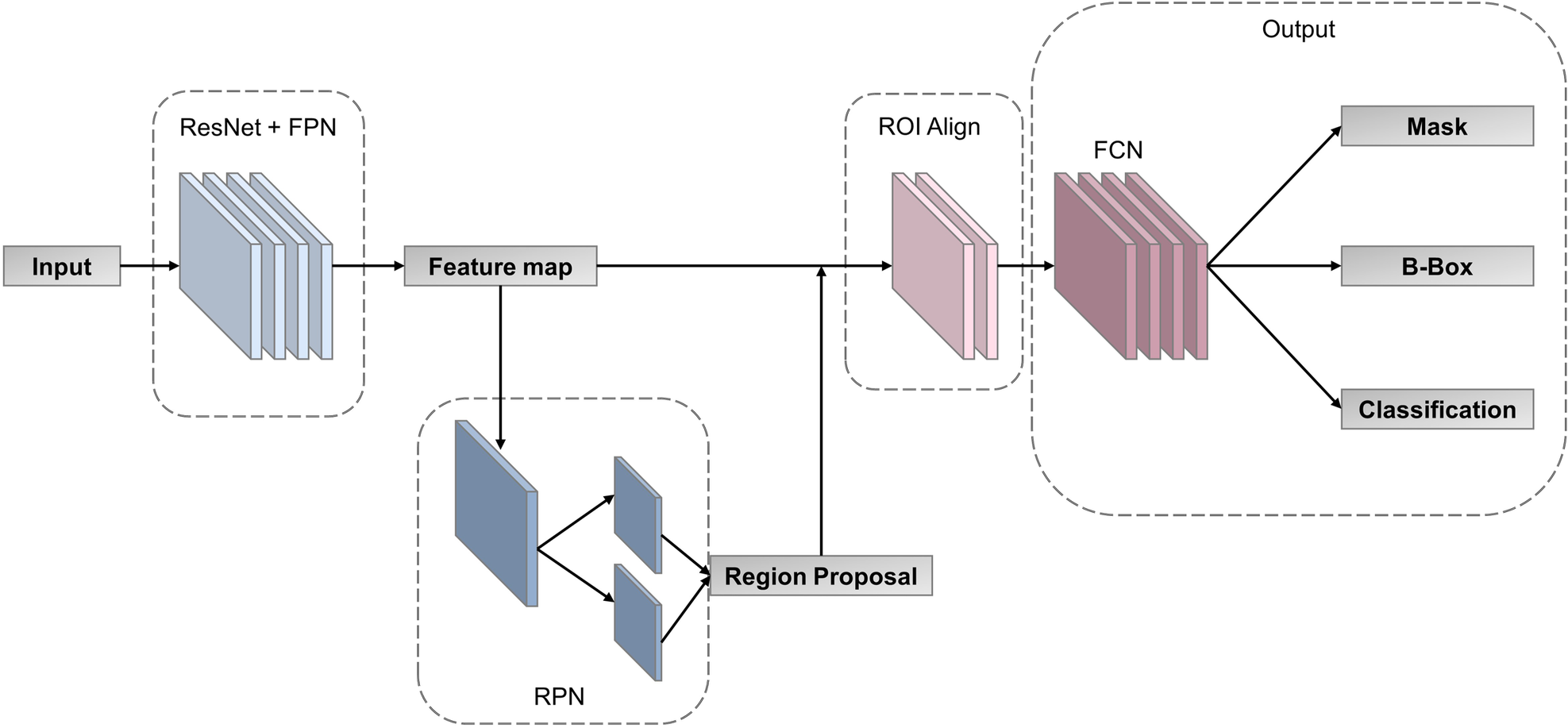 In order to find the most suitable multi-task deep learning network (MTDL-Net), we compared Fast R-CNN (25), Faster R-CNN (26), Mask R-CNN (27) and RS-Net (28) for white matter segmentations and WMI status prediction. Based on the result of this ablation experiment (detailed in Supplementary Material), we used Mask R-CNN as our MTDL-Net. Mask R-CNN is an improved convolutional neural network proposed based on Faster R-CNN (25). It can accomplish target detection and semantic segmentation simultaneously. The structure of our multi-task deep learning model is divided into three main parts, which is shown in Figure 4. The first part is feature pyramid networks (FPN) (29), which is used for feature map extraction from the whole image. The second part is region proposal network (RPN) (26), which is used for ROI proposal generation. The third part is output layer for classification, bounding box (B-Box) detection, and ROI mask segmentation. There is an ROI Align layer between the second and third parts for obtaining the feature maps corresponding to each ROI. Our multi-task deep learning model has three final outputs: classification labels, B-Box, and semantic segmentation ROIs.